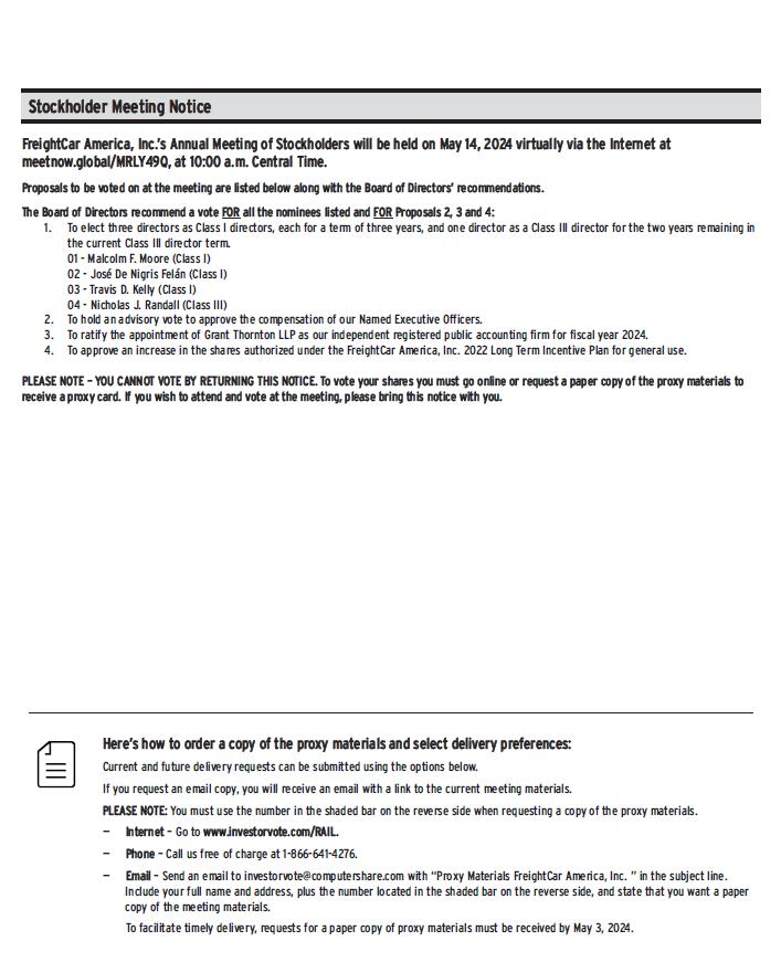 Stockholder Meeting Notice FreightCar America, Inc.'s Annual Meeting of Stockholders will be held on May 14, 2024 virtually via the Internet at meetnow.global/MRLY49Q, at 10:00 a.m. Central Time. Proposals to be voted on at the meeting are listed below along with the Board of Directors' recommendations. The Board of Directors recommend a vote FOR all the nominees listed and FOR Proposals 2, 3 and 4: 1. To elect three directors as Class I directors, each for a term of three years, and one director as a Class III director for the two years remaining in the current Class III director term. 01 - Malcolm F. Moore (Class I) 02 - Jose De Nigris Felan (Class I) 03 - Travis D. Kelly (Class I) 04 - Nicholas J. Randall (Class III) 2. To hold an advisory vote to approve the compensation of our Named Executive Officers. 3. To ratify the appointment of Grant Thornton LLP as our independent registered public accounting firm for fiscal year 2024. 4. To approve an increase in the shares authorized under the FreightCar America, Inc. 2022 Long Term Incentive Plan for general use. PLEASE NOTE - YOU CANNOT VOTE BY RETURNING THIS NOTICE. To vote your shares you must go online or request a paper copy of the proxy materials to receive a proxy card. If you wish to attend and vote at the meeting, please bring this notice with you. Here's how to order a copy of the proxy materials and select delivery preferences: Current and future delivery requests can be submitted using the options below. If you request an email copy, you will receive an email with a link to the current meeting materials. PLEASE NOTE: You must use the number in the shaded bar on the reverse side when requesting a copy of the proxy materials. - Internet - Go to www.investorvote.com/RAIL. - Phone - Call us free of charge at 1-866-641-4276. - Email - Send an email to investorvote@computershare.com with "Proxy Materials FreightCar America, Inc. " in the subject line. Include your full name and address, plus the number located in the shaded bar on the reverse side, and state that you want a paper copy of the meeting materials. To facilitate timely delivery, requests for a paper copy of proxy materials must be received by May 3, 2024.
