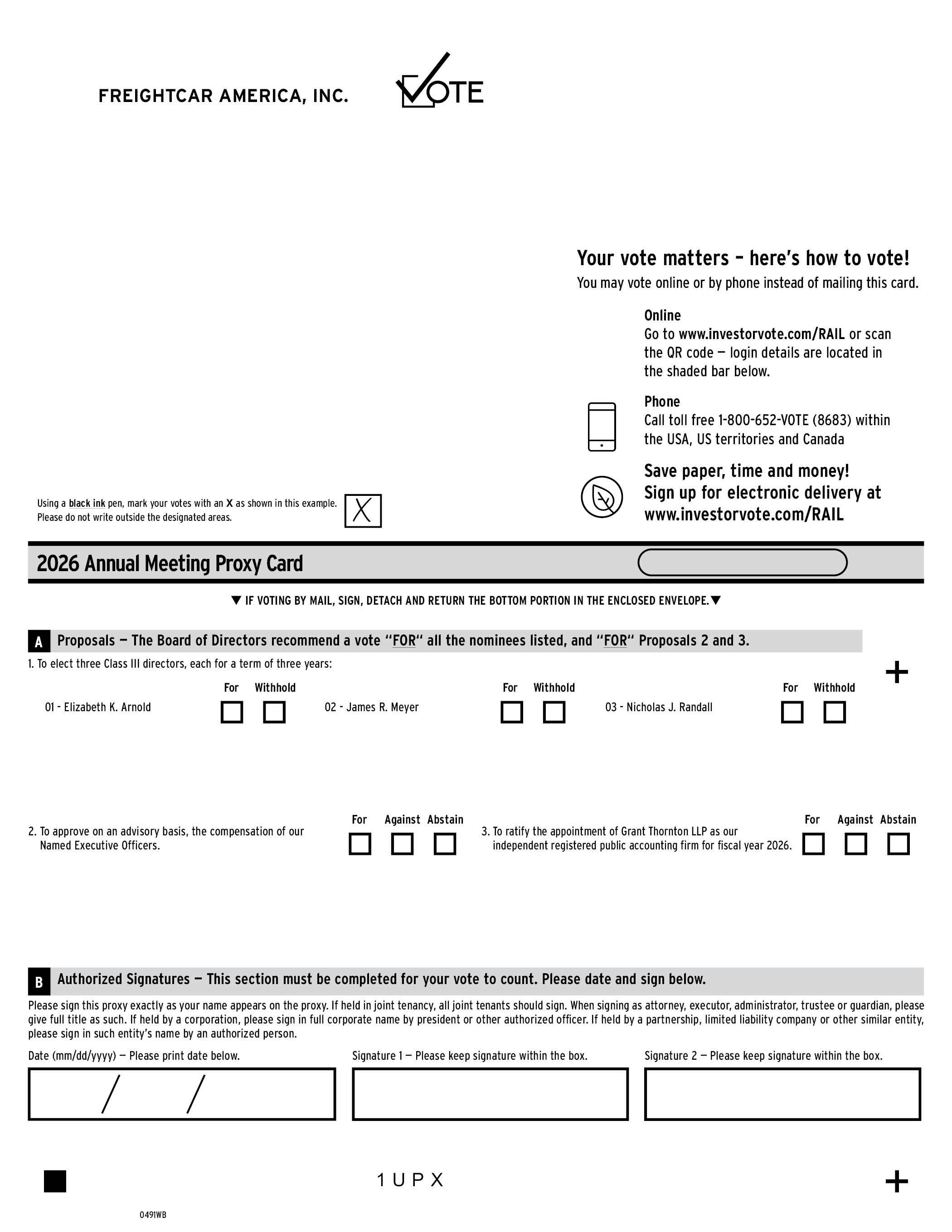 FREIGHTCAR AMERICA, INC. of mailing this card. Your vote matters – here’s how to vote! You may vote online or by phone instead of mailing this card. Online Go to www.investorvote.com/RAIL or scan the QR code — login details are located in the shaded bar below. Phone Call toll free 1-800-652-VOTE (8683) within the USA, US territories and Canada Save paper, time and money! Sign up for electronic delivery at www.investorvote.com/RAIL Using a black ink pen, mark your votes with an X as shown in this example. Please do not write outside the designated areas. 2026 Annual Meeting Proxy Card IF VOTING BY MAIL, SIGN, DETACH AND RETURN THE BOTTOM PORTION IN THE ENCLOSED ENVELOPE. A Proposals — The Board of Directors recommend a vote “FOR“ all the nominees listed, and “FOR“ Proposals 2 and 3. 1. To elect three Class III directors, each for a term of three years: 01 - Elizabeth K. Arnold For Withhold 02 - James R. Meyer For Withhold 03 - Nicholas J. Randall For Withhold 2. To approve on an advisory basis, the compensation of our Named Executive Officers. For Against Abstain 3. To ratify the appointment of Grant Thornton LLP as our independent registered public accounting firm for fiscal year 2026. For Against Abstain B Authorized Signatures — This section must be completed for your vote to count. Please date and sign below. Please sign this proxy exactly as your name appears on the proxy. If held in joint tenancy, all joint tenants should sign. When signing as attorney, executor, administrator, trustee or guardian, please give full title as such. If held by a corporation, please sign in full corporate name by president or other authorized officer. If held by a partnership, limited liability company or other similar entity, please sign in such entity’s name by an authorized person. Date (mm/dd/yyyy) — Please print date below. Signature 1 — Please keep signature within the box Signature 2 — Please keep signature within the box.