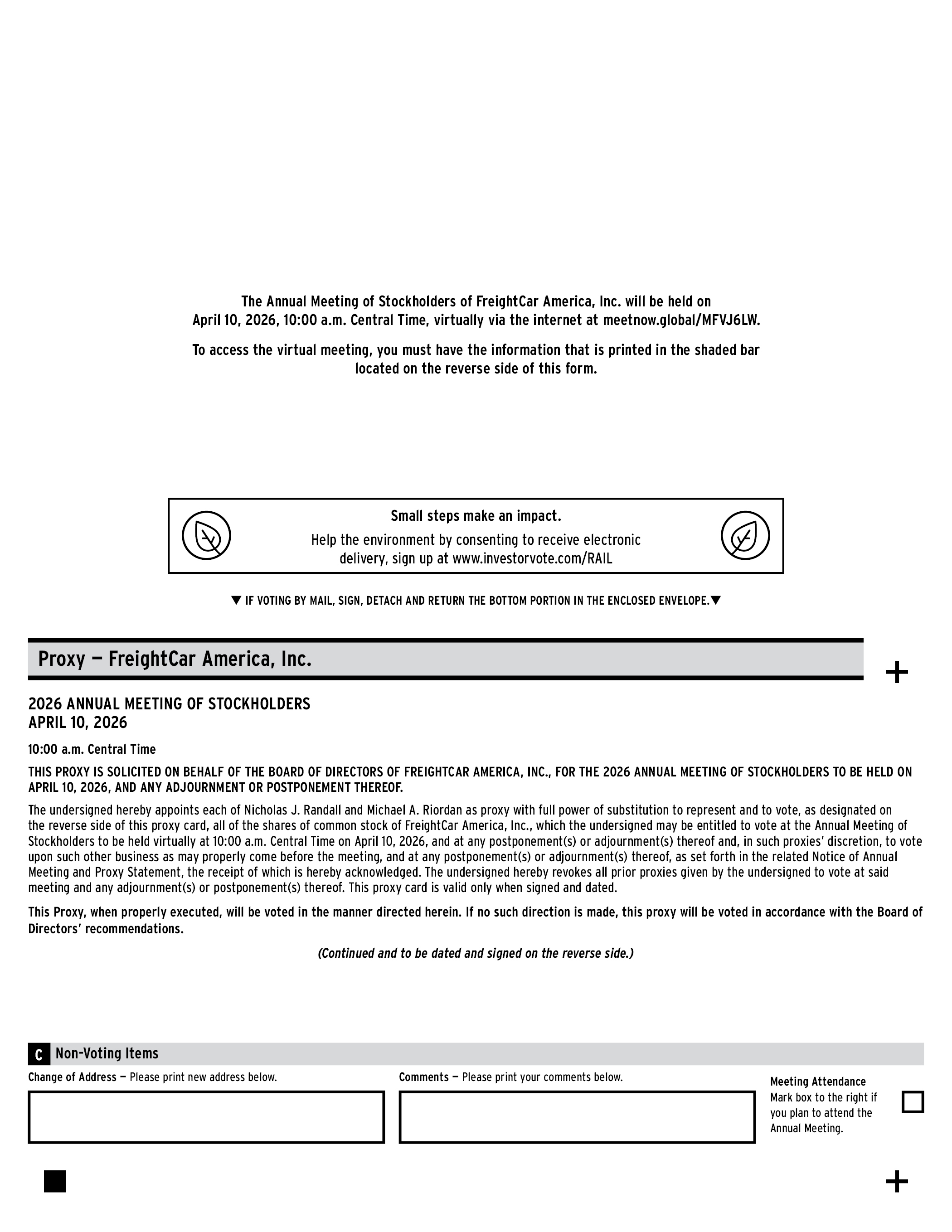 The Annual Meeting of Stockholders of FreightCar America, Inc. will be held on April 10, 2026, 10:00 a.m. Central Time, virtually via the internet at meetnow.global/MFVJ6LW. To access the virtual meeting, you must have the information that is printed in the shaded bar located on the reverse side of this form. Small steps make an impact. Help the environment by consenting to receive electronic delivery, sign up at www.investorvote.com/RAIL IF VOTING BY MAIL, SIGN, DETACH AND RETURN THE BOTTOM PORTION IN THE ENCLOSED ENVELOPE. Proxy — FreightCar America, Inc. 2026 ANNUAL MEETING OF STOCKHOLDERS APRIL 10, 2026 10:00 a.m. Central Time THIS PROXY IS SOLICITED ON BEHALF OF THE BOARD OF DIRECTORS OF FREIGHTCAR AMERICA, INC., FOR THE 2026 ANNUAL MEETING OF STOCKHOLDERS TO BE HELD ON APRIL 10, 2026, AND ANY ADJOURNMENT OR POSTPONEMENT THEREOF. The undersigned hereby appoints each of Nicholas J. Randall and Michael A. Riordan as proxy with full power of substitution to represent and to vote, as designated on the reverse side of this proxy card, all of the shares of common stock of FreightCar America, Inc., which the undersigned may be entitled to vote at the Annual Meeting of Stockholders to be held virtually at 10:00 a.m. Central Time on April 10, 2026, and at any postponement(s) or adjournment(s) thereof and, in such proxies’ discretion, to vote upon such other business as may properly come before the meeting, and at any postponement(s) or adjournment(s) thereof, as set forth in the related Notice of Annual Meeting and Proxy Statement, the receipt of which is hereby acknowledged. The undersigned hereby revokes all prior proxies given by the undersigned to vote at said meeting and any adjournment(s) or postponement(s) thereof. This proxy card is valid only when signed and dated. This Proxy, when properly executed, will be voted in the manner directed herein. If no such direction is made, this proxy will be voted in accordance with the Board of Directors’ recommendations. (Continued and to be dated and signed on the reverse side.) C Non-Voting Items Change of Address — Please print new address below. Comments — Please print your comments below. Meeting Attendance Mark box to the right if you plan to attend the Annual Meeting.