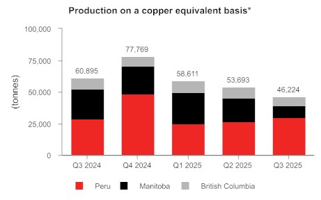 • Achieved consolidated copper production of 24,205 tonnes and consolidated gold production of 53,581 ounces in the third quarter, demonstrating strong operational resilience with Manitoba operations suspended for the majority of the quarter due to the wildfire evacuations and temporary operational interruptions in Peru.
