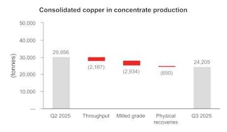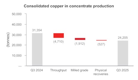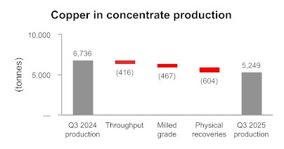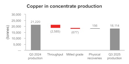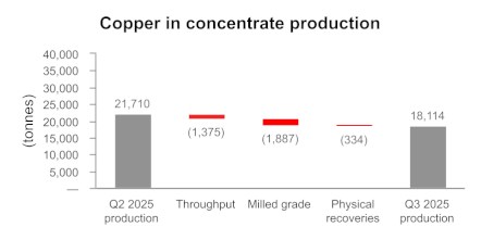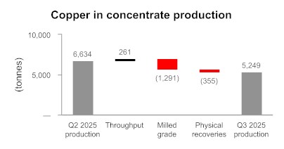 • British Columbia operations produced 5,249 tonnes of copper in the third quarter at a cash cost1 per pound of copper produced, net of by-product credits, of $3.21. While the initial phase of the conversion of the third ball mill to a second semi-autogenous grinding ("SAG") mill was completed successfully in the third quarter, there was required maintenance at the primary SAG mill at the end of September and into early October, which is expected to result in reduced mill throughput levels for the balance of 2025 and full year copper production in British Columbia is now expected to be below the low end of the 2025 annual guidance range.