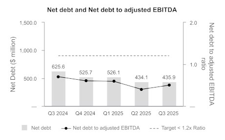 • Net debt1 reduced to $435.9 million as at September 30, 2025 compared to $525.7 million at December 31, 2024, a decrease of $89.8 million year-to-date.
