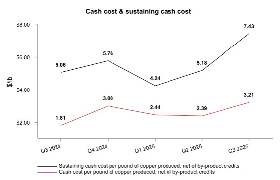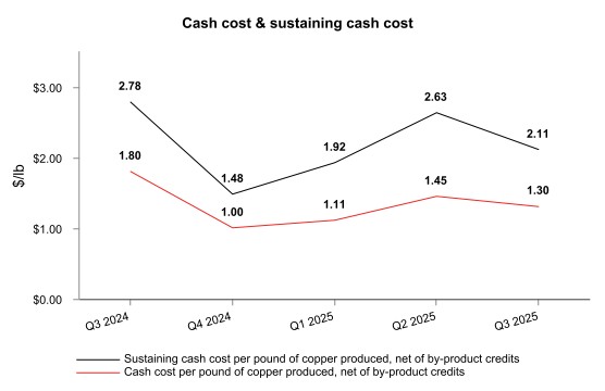 Consolidated sustaining cash cost per pound of copper produced, net of by-product credits1, was $2.09 in the third quarter of 2025, compared to $1.65 in the second quarter of 2025 and $1.71 in the third quarter of 2024. The increase was primarily due to the same factors impacting consolidated cash cost noted above.