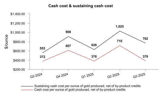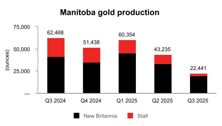 • Manitoba operations produced 22,441 ounces of gold in the third quarter, lower than quarterly cadence expectations as a result of temporary production interruptions from mandatory wildfire evacuations that shut down operations for the majority of the third quarter and deferred gold production. A business interruption insurance claim has been submitted to compensate for a portion of the wildfire-related downtime. Manitoba cash cost1 per ounce of gold produced, net of by-product credits, was $379 in the third quarter. Subsequent to the quarter, due to additional unplanned down time in October as a result of winter storm power outages, some gold production has been further deferred and full year gold production in Manitoba is now expected to be slightly below the low end of the 2025 annual guidance range.