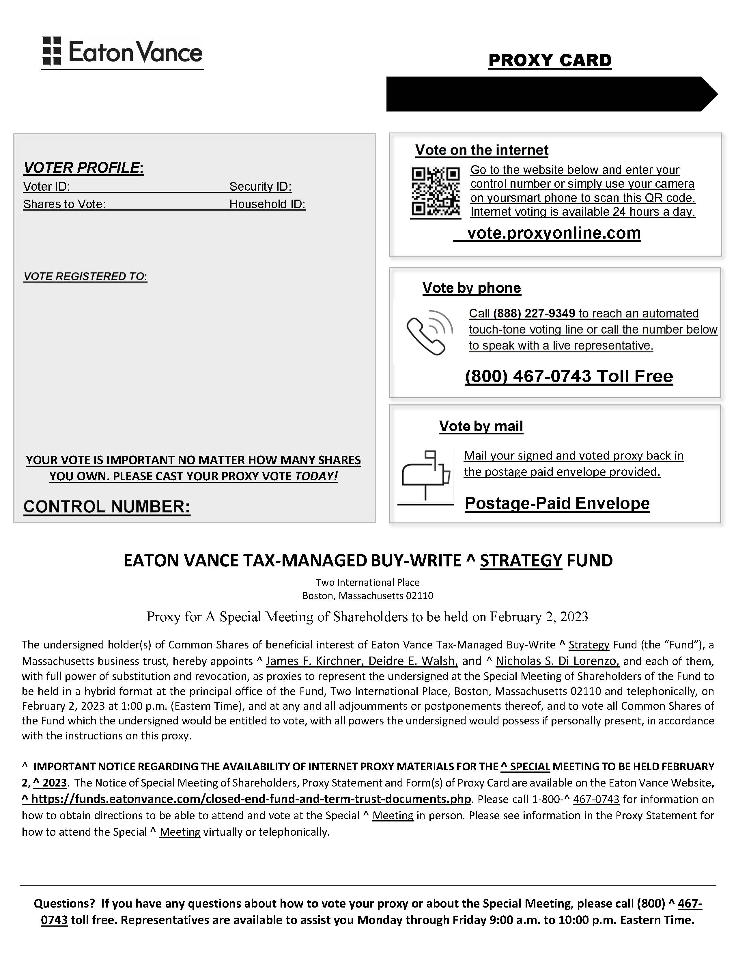 We cordially invite you to attend a Special Meeting of Shareholders of Eaton Vance Tax-Managed Buy-Write Strategy Fund (“Acquired Fund”), which will be held in a hybrid format at the principal office of Acquired Fund, Two International Place, Boston, Massachusetts 02110, and telephonically on February 2, 2023 at 1:00 p.m. Eastern time, to consider a proposal to approve an Agreement and Plan of Reorganization (“Plan”) providing for the reorganization (the “Reorganization”) of Acquired Fund with and into Eaton Vance Tax-Managed Buy-Write Opportunities Fund (“Acquiring Fund” and, together with Acquired Fund, the “Funds”). Under the terms of the Plan, if approved, the shares of Acquired Fund will, in effect, be exchanged for new common shares of Acquiring Fund with an equal aggregate net asset value.