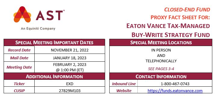I am calling on a recorded line regarding your current investment with Eaton Vance Tax-Managed Buy-Write Strategy Fund. I wanted to confirm that you have received the proxy material for the Special Meeting of Shareholders scheduled to take place on February 2, 2023.