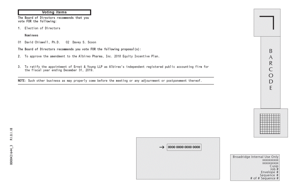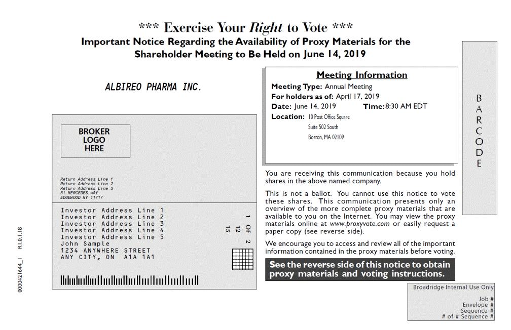 *** Exercise Your Right to Vote *** Important Notice Regarding the Availability of Proxy Materials for the Shareholder Meeting to Be Held on June 14, 2019 ALBIREO PHARMA INC. Date: June 14, 2019 Time: 8:30 AM EDT You are receiving this communication because you hold shares in the above named company. This is not a ballot. You cannot use this notice to vote these shares. This communication presents only an overview of the more complete proxy materials that are available to you on the Internet. You may view the proxy materials online at www.proxyvote.com or easily request a paper copy (see reverse side). We encourage you to access and review all of the important information contained in the proxy materials before voting. Envelope # # of # Sequence # 1 OF 2 12 15 0000421644_1 R1.0.1.18 Broadridge Internal Use Only Job # Sequence # See the reverse side of this notice to obtain proxy materials and voting instructions. LOGO Return Address Line 1 Return Address Line 2 Return Address Line 3 51 MERCEDES WAY EDGEWOOD NY 11717 Investor Address Line 1 Investor Address Line 2 Investor Address Line 3 Investor Address Line 4 Investor Address Line 5 John Sample 1234 ANYWHERE STREET ANY CITY, ON A1A 1A1 1234567 1234567 1234567 1234567 1234567 1234567 BROKER HERE Meeting Information Meeting Type: Annual Meeting For holders as of: April 17, 2019 Location: 10 Post Office Square Suite 502 South Boston, MA 02109 B A R C O D E