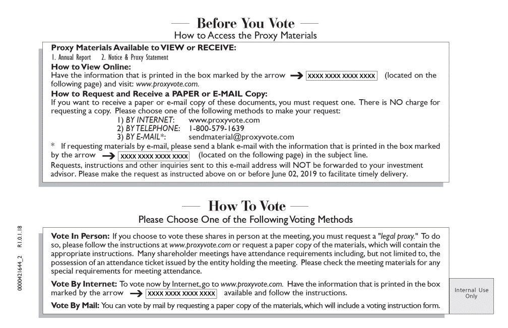 Before You Vote How to Access the Proxy Materials Proxy Materials Available to VIEW or RECEIVE: Have the information that is printed in the box marked by the arrow (located on the by the arrow (located on the following page) in the subject line. How To Vote Please Choose One of the Following Voting Methods Only Vote By Mail: You can vote by mail by requesting a paper copy of the materials, which will include a voting instruction form. 0000421644_2 R1.0.1.18 Vote In Person: If you choose to vote these shares in person at the meeting, you must request a "legal proxy." To do so, please follow the instructions at www.proxyvote.com or request a paper copy of the materials, which will contain the appropriate instructions. Many shareholder meetings have attendance requirements including, but not limited to, the possession of an attendance ticket issued by the entity holding the meeting. Please check the meeting materials for any special requirements for meeting attendance. Vote By Internet: To vote now by Internet, go to www.proxyvote.com. Have the information that is printed in the box marked by the arrow available and follow the instructions. Internal Use 1. Annual Report2. Notice & Proxy Statement How to View Online: following page) and visit: www.proxyvote.com. How to Request and Receive a PAPER or E-MAIL Copy: If you want to receive a paper or e-mail copy of these documents, you must request one. There is NO charge for requesting a copy. Please choose one of the following methods to make your request: 1) BY INTERNET:www.proxyvote.com 2) BY TELEPHONE:1-800-579-1639 3) BY E-MAIL*:sendmaterial@proxyvote.com * If requesting materials by e-mail, please send a blank e-mail with the information that is printed in the box marked Requests, instructions and other inquiries sent to this e-mail address will NOT be forwarded to your investment advisor. Please make the request as instructed above on or before June 02, 2019 to facilitate timely delivery.