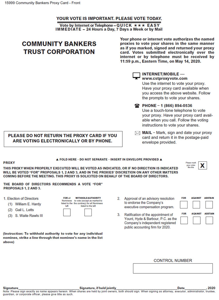 15999 Community Bankers Proxy Card - Front YOUR VOTE IS IMPORTANT. PLEASE VOTE TODAY. E A SY IMMEDIATE - 24 Hours a Day, 7 Days a Week or by Mail Vote by Internet or Telephone - Q U I CK Your phone or internet vote authorizes the named COMMUNITY BANKERS proxies to vote your shares in the same manner as if you marked, signed and returned your proxy TRUST CORPORATION card. Votes submitted electronically over the internet or by telephone must be received by 11:59 p.m., Eastern Time, on May 14, 2020. INTERNET/MOBILE – www.cstproxyvote.com Use the internet to vote your proxy. Have your proxy card available when you access the above website. Follow the prompts to vote your shares. PHONE – 1 (866) 894-0536 Use a touch-tone telephone to vote your proxy. Have your proxy card available when you call. Follow the voting instructions to vote your shares. MAIL – Mark, sign and date your proxy PLEASE DO NOT RETURN THE PROXY CARD IF YOU card and return it in the postage-paid ARE VOTING ELECTRONICALLY OR BY PHONE. envelope provided. FOLD HERE • DO NOT SEPARATE • INSERT IN ENVELOPE PROVIDED PROXY Please mark your votes X THIS PROXY WHEN PROPERLY EXECUTED WILL BE VOTED AS INDICATED, OR IF NO DIRECTION IS INDICATED like this WILL BE VOTED “FOR” PROPOSALS 1, 2 AND 3, AND IN THE PROXIES’ DISCRETION ON ANY OTHER MATTERS COMING BEFORE THE MEETING. THIS PROXY IS SOLICITED ON BEHALF OF THE BOARD OF DIRECTORS. THE BOARD OF DIRECTORS RECOMMENDS A VOTE “FOR” PROPOSALS 1, 2 AND 3. 1. Election of Directors FOR all WITHHOLD AUTHORITY 2. Approval of an advisory resolution FOR AGAINST ABSTAIN Nominees to vote (except as marked to (1) William E. Hardy listed to the the contrary) for all Nominees to endorse the Company’s left listed to the left executive compensation program. (2) Gail L. Letts 3. Ratification of the appointment of FOR AGAINST ABSTAIN (3) S. Waite Rawls III Yount, Hyde & Barbour, P.C. as the Company’s independent registered public accounting firm for 2020. (Instruction: To withhold authority to vote for any individual nominee, strike a line through that nominee’s name in the list above) CONTROL NUMBER Signature_____________________________________Signature, if held jointly_____________________________________Date_____________, 2020 Note: Please sign exactly as name appears hereon. When shares are held by joint owners, both should sign. When signing as attorney, executor, administrator, trustee, guardian, or corporate officer, please give title as such.