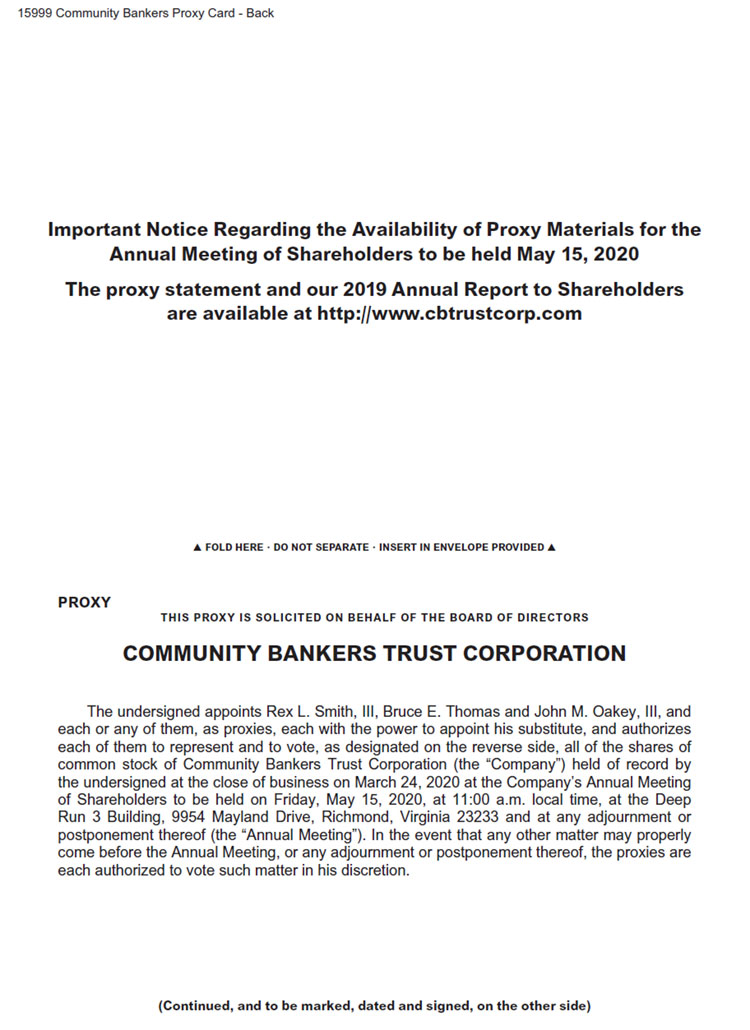 15999 Community Bankers Proxy Card - Back Important Notice Regarding the Availability of Proxy Materials for the Annual Meeting of Shareholders to be held May 15, 2020 The proxy statement and our 2019 Annual Report to Shareholders are available at http://www.cbtrustcorp.com FOLD HERE • DO NOT SEPARATE • INSERT IN ENVELOPE PROVIDED PROXY THIS PROXY IS SOLICITED ON BEHALF OF THE BOARD OF DIRECTORS COMMUNITY BANKERS TRUST CORPORATION The undersigned appoints Rex L. Smith, III, Bruce E. Thomas and John M. Oakey, III, and each or any of them, as proxies, each with the power to appoint his substitute, and authorizes each of them to represent and to vote, as designated on the reverse side, all of the shares of common stock of Community Bankers Trust Corporation (the “Company”) held of record by the undersigned at the close of business on March 24, 2020 at the Company’s Annual Meeting of Shareholders to be held on Friday, May 15, 2020, at 11:00 a.m. local time, at the Deep Run 3 Building, 9954 Mayland Drive, Richmond, Virginia 23233 and at any adjournment or postponement thereof (the “Annual Meeting”). In the event that any other matter may properly come before the Annual Meeting, or any adjournment or postponement thereof, the proxies are each authorized to vote such matter in his discretion. (Continued, and to be marked, dated and signed, on the other side)