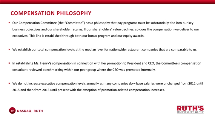 Even accounting for the Promotional Equity Award to Ms. Henry, both ISS and Glass Lewis note that RUTH’s pay is strongly aligned with WELL-ALIGNED PAY FOR PERFORMANCE performance relative to peers $9,000 200.0% $7,681 $8,000 176.7% $7,000 160.0% 163.0% $6,106 $6,000 136.8% $5,000 120.0% 119.6% $4,000 97.8% $2,977 $2,818 $3,000 $2,471 80.0% $2,000 $1,000 $0 40.0% 2014 2015 2016 2017 2018 Cheryl Henry Pay ($000) Indexed TSR CEO Pay ($000) becomes CEO Glass Lewis: “The Company paid moderately more than its peers, but performed better than its peers.” 9 NASDAQ: RUTHEven accounting for the Promotional Equity Award to Ms. Henry, both ISS and Glass Lewis note that RUTH’s pay is strongly aligned with WELL-ALIGNED PAY FOR PERFORMANCE performance relative to peers $9,000 200.0% $7,681 $8,000 176.7% $7,000 160.0% 163.0% $6,106 $6,000 136.8% $5,000 120.0% 119.6% $4,000 97.8% $2,977 $2,818 $3,000 $2,471 80.0% $2,000 $1,000 $0 40.0% 2014 2015 2016 2017 2018 Cheryl Henry Pay ($000) Indexed TSR CEO Pay ($000) becomes CEO Glass Lewis: “The Company paid moderately more than its peers, but performed better than its peers.” 9 NASDAQ: RUTH