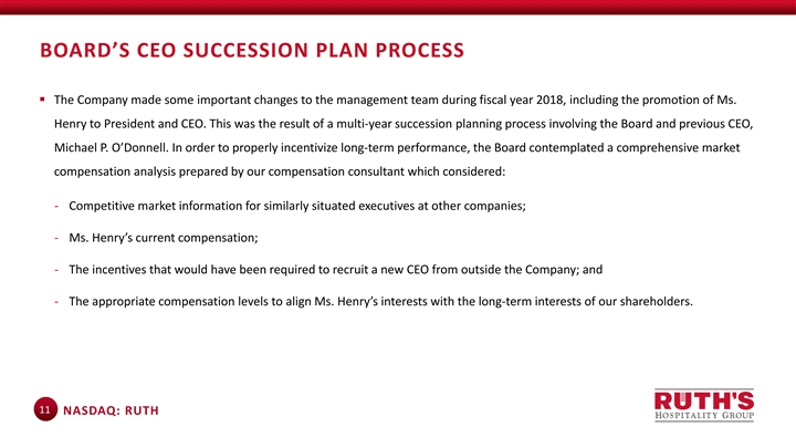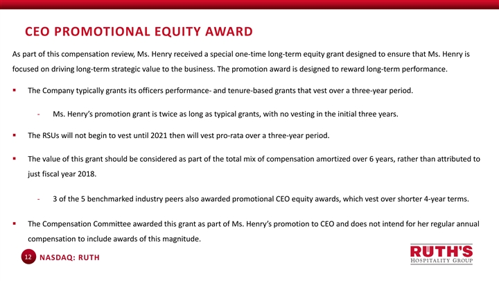 BOARD’S CEO SUCCESSION PLAN PROCESS § The Company made some important changes to the management team during fiscal year 2018, including the promotion of Ms. Henry to President and CEO. This was the result of a multi-year succession planning process involving the Board and previous CEO, Michael P. O’Donnell. In order to properly incentivize long-term performance, the Board contemplated a comprehensive market compensation analysis prepared by our compensation consultant which considered: - Competitive market information for similarly situated executives at other companies; - Ms. Henry’s current compensation; - The incentives that would have been required to recruit a new CEO from outside the Company; and - The appropriate compensation levels to align Ms. Henry’s interests with the long-term interests of our shareholders. 11 NASDAQ: RUTHBOARD’S CEO SUCCESSION PLAN PROCESS § The Company made some important changes to the management team during fiscal year 2018, including the promotion of Ms. Henry to President and CEO. This was the result of a multi-year succession planning process involving the Board and previous CEO, Michael P. O’Donnell. In order to properly incentivize long-term performance, the Board contemplated a comprehensive market compensation analysis prepared by our compensation consultant which considered: - Competitive market information for similarly situated executives at other companies; - Ms. Henry’s current compensation; - The incentives that would have been required to recruit a new CEO from outside the Company; and - The appropriate compensation levels to align Ms. Henry’s interests with the long-term interests of our shareholders. 11 NASDAQ: RUTH