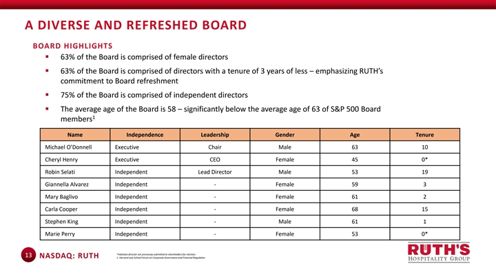 A DIVERSE AND REFRESHED BOARD BOARD HIGHLIGHTS § 63% of the Board is comprised of female directors § 63% of the Board is comprised of directors with a tenure of 3 years of less – emphasizing RUTH’s commitment to Board refreshment § 75% of the Board is comprised of independent directors § The average age of the Board is 58 – significantly below the average age of 63 of S&P 500 Board 1 members Name Independence Leadership Gender Age Tenure Michael O’Donnell Executive Chair Male 63 10 Cheryl Henry Executive CEO Female 45 0* Robin Selati Independent Lead Director Male 53 19 Giannella Alvarez Independent - Female 59 3 Mary Baglivo Independent - Female 61 2 Carla Cooper Independent - Female 68 15 Stephen King Independent - Male 61 1 Marie Perry Independent - Female 53 0* *Indicates director not previously submitted to shareholders for election. 13 NASDAQ: RUTH 1. Harvard Law School Forum on Corporate Governance and Financial RegulationA DIVERSE AND REFRESHED BOARD BOARD HIGHLIGHTS § 63% of the Board is comprised of female directors § 63% of the Board is comprised of directors with a tenure of 3 years of less – emphasizing RUTH’s commitment to Board refreshment § 75% of the Board is comprised of independent directors § The average age of the Board is 58 – significantly below the average age of 63 of S&P 500 Board 1 members Name Independence Leadership Gender Age Tenure Michael O’Donnell Executive Chair Male 63 10 Cheryl Henry Executive CEO Female 45 0* Robin Selati Independent Lead Director Male 53 19 Giannella Alvarez Independent - Female 59 3 Mary Baglivo Independent - Female 61 2 Carla Cooper Independent - Female 68 15 Stephen King Independent - Male 61 1 Marie Perry Independent - Female 53 0* *Indicates director not previously submitted to shareholders for election. 13 NASDAQ: RUTH 1. Harvard Law School Forum on Corporate Governance and Financial Regulation