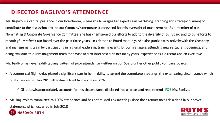 DIRECTOR BAGLIVO’S ATTENDENCE Ms. Baglivo is a central presence in our boardroom, where she leverages her expertise in marketing, branding and strategic planning to contribute to the discussion around our Company’s corporate strategy and Board’s oversight of management. As a member of our Nominating & Corporate Governance Committee, she has championed our efforts to add to the diversity of our Board and to our efforts to meaningfully refresh our Board over the past three years. In addition to Board meetings, she also participates actively with the Company and management team by participating in regional leadership training events for our managers, attending new restaurant openings, and being available to our management team for advice and counsel based on her many years’ experience as a director and an executive. Ms. Baglivo has never exhibited any pattern of poor attendance – either on our Board or her other public company boards. § A commercial flight delay played a significant part in her inability to attend the committee meetings, the extenuating circumstance which on its own caused her 2018 attendance level to drop below 75%. ü Glass Lewis appropriately accounts for this circumstance disclosed in our proxy and recommends FOR Ms. Baglivo. § Ms. Baglivo has committed to 100% attendance and has not missed any meetings since the circumstances described in our proxy statement, which occurred in July 2018. 14 NASDAQ: RUTHDIRECTOR BAGLIVO’S ATTENDENCE Ms. Baglivo is a central presence in our boardroom, where she leverages her expertise in marketing, branding and strategic planning to contribute to the discussion around our Company’s corporate strategy and Board’s oversight of management. As a member of our Nominating & Corporate Governance Committee, she has championed our efforts to add to the diversity of our Board and to our efforts to meaningfully refresh our Board over the past three years. In addition to Board meetings, she also participates actively with the Company and management team by participating in regional leadership training events for our managers, attending new restaurant openings, and being available to our management team for advice and counsel based on her many years’ experience as a director and an executive. Ms. Baglivo has never exhibited any pattern of poor attendance – either on our Board or her other public company boards. § A commercial flight delay played a significant part in her inability to attend the committee meetings, the extenuating circumstance which on its own caused her 2018 attendance level to drop below 75%. ü Glass Lewis appropriately accounts for this circumstance disclosed in our proxy and recommends FOR Ms. Baglivo. § Ms. Baglivo has committed to 100% attendance and has not missed any meetings since the circumstances described in our proxy statement, which occurred in July 2018. 14 NASDAQ: RUTH