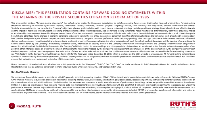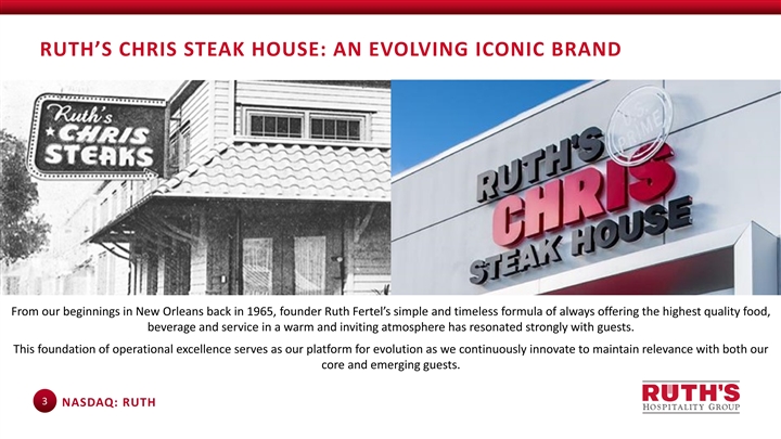 DISCLAIMER: THIS PRESENTATION CONTAINS FORWARD-LOOKING STATEMENTS WITHIN THE MEANING OF THE PRIVATE SECURITIES LITIGATION REFORM ACT OF 1995. This presentation contains “forward-looking statements” that reflect, when made, the Company’s expectations or beliefs concerning future events that involve risks and uncertainties. Forward-looking statements frequently are identified by the words “believe,” “anticipate,” “expect,” “estimate,” “intend,” “project,” “targeting,” “will be,” “will continue,” “will likely result,” or other similar words and phrases. Similarly, statements herein that describe the Company’s objectives, plans or goals, including with respect to new restaurant openings, capital expenditures, strategy, financial outlook, our effective tax rate and the impact of healthcare inflation, recent accounting pronouncements and tax reform legislation, also are forward-looking statements. Actual results could differ materially from those projected, implied or anticipated by the Company’s forward-looking statements. Some of the factors that could cause actual results to differ include: reductions in the availability of, or increases in the cost of, USDA Prime grade beef, fish and other food items; changes in economic conditions and general trends; the loss of key management personnel; the effect of market volatility on the Company’s stock price; health concerns about beef or other food products; the effect of competition in the restaurant industry; changes in consumer preferences or discretionary spending; labor shortages or increases in labor costs; the impact of federal, state or local government regulations relating to income taxes, unclaimed property, Company employees, the sale or preparation of food, the sale of alcoholic beverages and the opening of new restaurants; harmful actions taken by the Company’s franchisees; a material failure, interruption or security breach of the Company’s information technology network; the Company’s indemnification obligations in connection with its sale of the Mitchell’s Restaurants; the Company’s ability to protect its name and logo and other proprietary information; an impairment in the financial statement carrying value of our goodwill, other intangible assets or property; the impact of litigation; the restrictions imposed by the Company’s credit agreement; and changes in, or the discontinuation of, the Company’s quarterly cash dividend payments or share repurchase program. For a discussion of these and other risks and uncertainties that could cause actual results to differ from those contained in the forward-looking statements, see “Risk Factors” in the Company’s Annual Report on Form 10-K for the fiscal year ended December 30, 2018, which is available on the SEC’s website at www.sec.gov. All forward-looking statements are qualified in their entirety by this cautionary statement, and the Company undertakes no obligation to revise or update this presentation to reflect events or circumstances after the date hereof. You should not assume that material events subsequent to the date of this presentation have not occurred. Unless the context otherwise indicates, all references in this presentation to the “Company,” “Ruth’s,” “we,” “us”, “our” or similar words are to Ruth’s Hospitality Group, Inc. and its subsidiaries. Ruth’s Hospitality Group, Inc. is a Delaware corporation formerly known as Ruth’s Chris Steak House, Inc., and was founded in 1965. Non-GAAP Financial Measures We prepare our financial statements in accordance with U.S. generally accepted accounting principles (GAAP). Within these investor presentation materials, we make reference to “Adjusted EBITDA,” a non- GAAP financial measure, calculated on the basis of net income, excluding interest, taxes, depreciation, amortization, gain/loss on assets, losses on impairment, restructuring benefits/expenses, loss/income on discontinued operations and additional items. We believe that this measurement represents a useful internal measure of performance. Accordingly, where we provide a non-GAAP measure like Adjusted EBITDA, it is done so that investors have the same financial data that management uses in evaluating performance with the belief that it will assist the investment community in assessing our underlying performance. However, because Adjusted EBITDA is not determined in accordance with GAAP, it is susceptible to varying calculations and not all companies calculate the measure in the same manner. As a result, Adjusted EBITDA as presented may not be directly comparable to a similarly titled measure presented by other companies. Adjusted EBITDA is presented as supplemental information and not as an alternative to any GAAP measurements. For a reconciliation of Adjusted EBITDA to net income, see the reconciliation table attached as Annex A to this presentation. 2 NASDAQ: RUTHDISCLAIMER: THIS PRESENTATION CONTAINS FORWARD-LOOKING STATEMENTS WITHIN THE MEANING OF THE PRIVATE SECURITIES LITIGATION REFORM ACT OF 1995. This presentation contains “forward-looking statements” that reflect, when made, the Company’s expectations or beliefs concerning future events that involve risks and uncertainties. Forward-looking statements frequently are identified by the words “believe,” “anticipate,” “expect,” “estimate,” “intend,” “project,” “targeting,” “will be,” “will continue,” “will likely result,” or other similar words and phrases. Similarly, statements herein that describe the Company’s objectives, plans or goals, including with respect to new restaurant openings, capital expenditures, strategy, financial outlook, our effective tax rate and the impact of healthcare inflation, recent accounting pronouncements and tax reform legislation, also are forward-looking statements. Actual results could differ materially from those projected, implied or antici