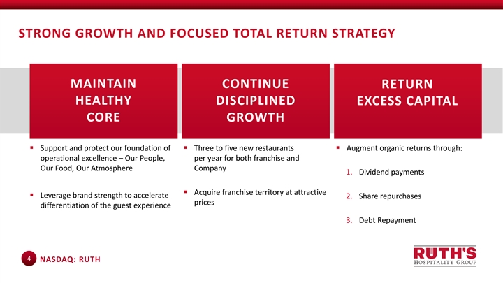 RUTH’S CHRIS STEAK HOUSE: AN EVOLVING ICONIC BRAND From our beginnings in New Orleans back in 1965, founder Ruth Fertel’s simple and timeless formula of always offering the highest quality food, beverage and service in a warm and inviting atmosphere has resonated strongly with guests. This foundation of operational excellence serves as our platform for evolution as we continuously innovate to maintain relevance with both our core and emerging guests. 3 NASDAQ: RUTHRUTH’S CHRIS STEAK HOUSE: AN EVOLVING ICONIC BRAND From our beginnings in New Orleans back in 1965, founder Ruth Fertel’s simple and timeless formula of always offering the highest quality food, beverage and service in a warm and inviting atmosphere has resonated strongly with guests. This foundation of operational excellence serves as our platform for evolution as we continuously innovate to maintain relevance with both our core and emerging guests. 3 NASDAQ: RUTH