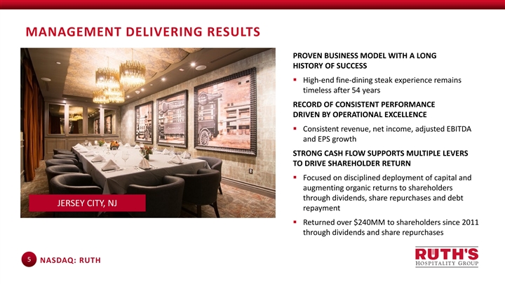 STRONG GROWTH AND FOCUSED TOTAL RETURN STRATEGY MAINTAIN CONTINUE RETURN HEALTHY DISCIPLINED EXCESS CAPITAL CORE GROWTH § Support and protect our foundation of § Three to five new restaurants § Augment organic returns through: operational excellence – Our People, per year for both franchise and Our Food, Our Atmosphere Company 1. Dividend payments § Acquire franchise territory at attractive § Leverage brand strength to accelerate 2. Share repurchases prices differentiation of the guest experience 3. Debt Repayment 4 NASDAQ: RUTHSTRONG GROWTH AND FOCUSED TOTAL RETURN STRATEGY MAINTAIN CONTINUE RETURN HEALTHY DISCIPLINED EXCESS CAPITAL CORE GROWTH § Support and protect our foundation of § Three to five new restaurants § Augment organic returns through: operational excellence – Our People, per year for both franchise and Our Food, Our Atmosphere Company 1. Dividend payments § Acquire franchise territory at attractive § Leverage brand strength to accelerate 2. Share repurchases prices differentiation of the guest experience 3. Debt Repayment 4 NASDAQ: RUTH