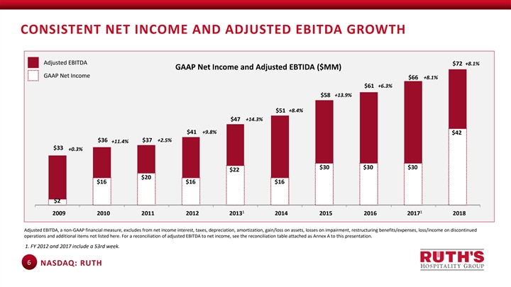 MANAGEMENT DELIVERING RESULTS PROVEN BUSINESS MODEL WITH A LONG HISTORY OF SUCCESS § High-end fine-dining steak experience remains timeless after 54 years RECORD OF CONSISTENT PERFORMANCE DRIVEN BY OPERATIONAL EXCELLENCE § Consistent revenue, net income, adjusted EBITDA and EPS growth STRONG CASH FLOW SUPPORTS MULTIPLE LEVERS TO DRIVE SHAREHOLDER RETURN § Focused on disciplined deployment of capital and augmenting organic returns to shareholders through dividends, share repurchases and debt JERSEY CITY, NJ repayment § Returned over $240MM to shareholders since 2011 through dividends and share repurchases 5 NASDAQ: RUTHMANAGEMENT DELIVERING RESULTS PROVEN BUSINESS MODEL WITH A LONG HISTORY OF SUCCESS § High-end fine-dining steak experience remains timeless after 54 years RECORD OF CONSISTENT PERFORMANCE DRIVEN BY OPERATIONAL EXCELLENCE § Consistent revenue, net income, adjusted EBITDA and EPS growth STRONG CASH FLOW SUPPORTS MULTIPLE LEVERS TO DRIVE SHAREHOLDER RETURN § Focused on disciplined deployment of capital and augmenting organic returns to shareholders through dividends, share repurchases and debt JERSEY CITY, NJ repayment § Returned over $240MM to shareholders since 2011 through dividends and share repurchases 5 NASDAQ: RUTH
