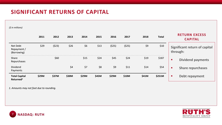 CONSISTENT NET INCOME AND ADJUSTED EBITDA GROWTH Adjusted EBITDA +8.1% $72 GAAP Net Income and Adjusted EBTIDA ($MM) GAAP Net Income $66 +8.1% $61 +6.3% $58 +13.9% $51 +8.4% $47 +14.3% $41 +9.8% $42 +2.5% $36 $37 +11.4% $33 +0.3% $30 $30 $30 $22 $20 $16 $16 $16 $2 1 1 2009 2010 2011 2012 2013 2014 2015 2016 2017 2018 Adjusted EBITDA, a non-GAAP financial measure, excludes from net income interest, taxes, depreciation, amortization, gain/loss on assets, losses on impairment, restructuring benefits/expenses, loss/income on discontinued operations and additional items not listed here. For a reconciliation of adjusted EBITDA to net income, see the reconciliation table attached as Annex A to this presentation. 1. FY 2012 and 2017 include a 53rd week. 6 NASDAQ: RUTHCONSISTENT NET INCOME AND ADJUSTED EBITDA GROWTH Adjusted EBITDA +8.1% $72 GAAP Net Income and Adjusted EBTIDA ($MM) GAAP Net Income $66 +8.1% $61 +6.3% $58 +13.9% $51 +8.4% $47 +14.3% $41 +9.8% $42 +2.5% $36 $37 +11.4% $33 +0.3% $30 $30 $30 $22 $20 $16 $16 $16 $2 1 1 2009 2010 2011 2012 2013 2014 2015 2016 2017 2018 Adjusted EBITDA, a non-GAAP financial measure, excludes from net income interest, taxes, depreciation, amortization, gain/loss on assets, losses on impairment, restructuring benefits/expenses, loss/income on discontinued operations and additional items not listed here. For a reconciliation of adjusted EBITDA to net income, see the reconciliation table attached as Annex A to this presentation. 1. FY 2012 and 2017 include a 53rd week. 6 NASDAQ: RUTH