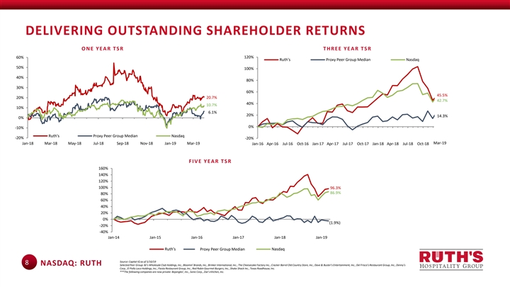 SIGNIFICANT RETURNS OF CAPITAL ($ in millions) RETURN EXCESS 2011 2012 2013 2014 2015 2016 2017 2018 Total CAPITAL Net Debt $29 ($23) $26 $6 $13 ($25) ($25) $9 $10 Significant return of capital Repayment / through: (Borrowing) Share $60 $15 $24 $45 $24 $19 $187 § Dividend payments Repurchases Dividend $4 $7 $8 $9 $11 $14 $54 § Share repurchases Payments Total Capital $29M $37M $30M $29M $45M $29M $10M $41M $251M § Debt repayment 1 Returned 1. Amounts may not foot due to rounding. 7 NASDAQ: RUTHSIGNIFICANT RETURNS OF CAPITAL ($ in millions) RETURN EXCESS 2011 2012 2013 2014 2015 2016 2017 2018 Total CAPITAL Net Debt $29 ($23) $26 $6 $13 ($25) ($25) $9 $10 Significant return of capital Repayment / through: (Borrowing) Share $60 $15 $24 $45 $24 $19 $187 § Dividend payments Repurchases Dividend $4 $7 $8 $9 $11 $14 $54 § Share repurchases Payments Total Capital $29M $37M $30M $29M $45M $29M $10M $41M $251M § Debt repayment 1 Returned 1. Amounts may not foot due to rounding. 7 NASDAQ: RUTH
