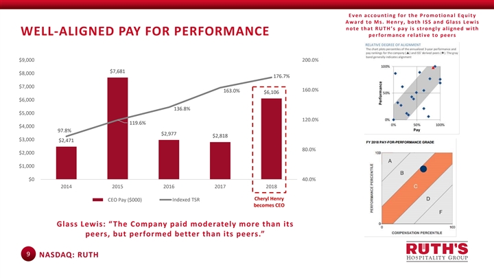DELIVERING OUTSTANDING SHAREHOLDER RETURNS ONE YEAR TSR THREE YEAR TSR 120% 60% Ruth's Proxy Peer Group Median Nasdaq 50% 100% 40% 80% 30% 60% 45.5% 20.7% 20% 42.7% 40% 10.7% 10% 6.1% 20% 14.3% 0% 0% -10% Ruth's Proxy Peer Group Median Nasdaq -20% -20% Jan-18 Mar-18 May-18 Jul-18 Sep-18 Nov-18 Jan-19 Mar-19 Mar-19 Jan-16 Apr-16 Jul-16 Oct-16 Jan-17 Apr-17 Jul-17 Oct-17 Jan-18 Apr-18 Jul-18 Oct-18 FIVE YEAR TSR 160% 140% 120% 100% 96.3% 86.9% 80% 60% 40% 20% 0% (1.9%) -20% -40% Jan-14 Jan-15 Jan-16 Jan-17 Jan-18 Jan-19 Ruth's Selected Peer Group Median Nasdaq Proxy Peer Group Median Source: Capital IQ as of 5/10/19 8 NASDAQ: RUTH Selected Peer Group: BJ’s Wholesale Club Holdings, Inc., Bloomin’ Brands, Inc., Brinker International, Inc., The Cheesecake Factory Inc., Cracker Barrel Old Country Store, Inc., Dave & Buster’s Entertainment, Inc., Del Frisco’s Restaurant Group, Inc., Denny’s Corp., El Pollo Loco Holdings, Inc., Fiesta Restaurant Group, Inc., Red Robin Gourmet Burgers, Inc., Shake Shack Inc., Texas Roadhouse, Inc. ***The following companies are now private: Bojangles’, Inc., Sonic Corp., Zoe’s Kitchen, Inc. DELIVERING OUTSTANDING SHAREHOLDER RETURNS ONE YEAR TSR THREE YEAR TSR 120% 60% Ruth's Proxy Peer Group Median Nasdaq 50% 100% 40% 80% 30% 60% 45.5% 20.7% 20% 42.7% 40% 10.7% 10% 6.1% 20% 14.3% 0% 0% -10% Ruth's Proxy Peer Group Median Nasdaq -20% -20% Jan-18 Mar-18 May-18 Jul-18 Sep-18 Nov-18 Jan-19 Mar-19 Mar-19 Jan-16 Apr-16 Jul-16 Oct-16 Jan-17 Apr-17 Jul-17 Oct-17 Jan-18 Apr-18 Jul-18 Oct-18 FIVE YEAR TSR 160% 140% 120% 100% 96.3% 86.9% 80% 60% 40% 20% 0% (1.9%) -20% -40% Jan-14 Jan-15 Jan-16 Jan-17 Jan-18 Jan-19 Ruth's Selected Peer Group Median Nasdaq Proxy Peer Group Median Source: Capital IQ as of 5/10/19 8 NASDAQ: RUTH Selected Peer Group: BJ’s Wholesale Club Holdings, Inc., Bloomin’ Brands, Inc., Brinker International, Inc., The Cheesecake Factory Inc., Cracker Barrel Old Country Store, Inc., Dave & Buster’s Entertainment, Inc., Del Frisco’s Restaurant Group, Inc., Denny’s Corp., El Pollo Loco Holdings, Inc., Fiesta Restaurant Group, Inc., Red Robin Gourmet Burgers, Inc., Shake Shack Inc., Texas Roadhouse, Inc. ***The following companies are now private: Bojangles’, Inc., Sonic Corp., Zoe’s Kitchen, Inc.