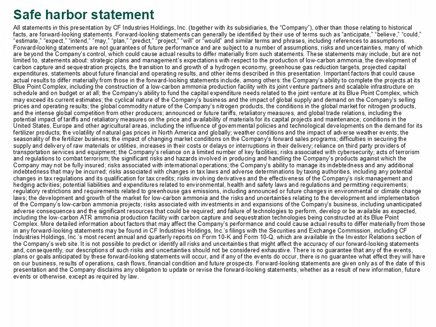 Safe harbor statement All statements in this presentation by CF Industries Holdings, Inc. (together with its subsidiaries, the “Company”), other th an those relating to historical facts, are forward - looking statements. Forward - looking statements can generally be identified by their use of terms such as “ant icipate,” “believe,” “could,” “estimate,” “expect,” “intend,” “may,” “plan,” “predict,” “project,” “will” or “would” and similar terms and phrases, includi ng references to assumptions. Forward - looking statements are not guarantees of future performance and are subject to a number of assumptions, risks and uncert ainties, many of which are beyond the Company’s control, which could cause actual results to differ materially from such statements. These statement s m ay include, but are not limited to, statements about: strategic plans and management’s expectations with respect to the production of low - carbon ammonia , the development of carbon capture and sequestration projects, the transition to and growth of a hydrogen economy, greenhouse gas reduction targe ts, projected capital expenditures, statements about future financial and operating results, and other items described in this presentation. Import ant factors that could cause actual results to differ materially from those in the forward - looking statements include, among others: the Company’s ability to complete the projects at its Blue Point Complex, including the construction of a low - carbon ammonia production facility with its joint venture partners and s calable infrastructure on schedule and on budget or at all; the Company’s ability to fund the capital expenditure needs related to the joint venture at it s Blue Point Complex, which may exceed its current estimates; the cyclical nature of the Company’s business and the impact of global supply and demand on the Company’s selling prices and operating results; the global commodity nature of the Company’s nitrogen products, the conditions in the global ma rke t for nitrogen products, and the intense global competition from other producers; announced or future tariffs, retaliatory measures, and global trade relations, including the potential impact of tariffs and retaliatory measures on the price and availability of materials for its capital projects and mai ntenance; conditions in the United States, Europe and other agricultural areas, including the influence of governmental policies and technological develo pme nts on the demand for its fertilizer products; the volatility of natural gas prices in North America and globally; weather conditions and the impact of ad verse weather events; the seasonality of the fertilizer business; the impact of changing market conditions on the Company’s forward sales programs; dif fic ulties in securing the supply and delivery of raw materials or utilities, increases in their costs or delays or interruptions in their delivery; rel ian ce on third party providers of transportation services and equipment; the Company’s reliance on a limited number of key facilities; risks associated with cy ber security; acts of terrorism and regulations to combat terrorism; the significant risks and hazards involved in producing and handling the Company’s produ cts against which the Company may not be fully insured; risks associated with international operations; the Company’s ability to manage its indebte dne ss and any additional indebtedness that may be incurred; risks associated with changes in tax laws and adverse determinations by taxing authorities , including any potential changes in tax regulations and its qualification for tax credits ; risks involving derivatives and the effectiveness of the Company’s risk management and hedging activities; potential liabilities and expenditures related to environmental, health and safety laws and regulations a nd permitting requirements; regulatory restrictions and requirements related to greenhouse gas emissions, including announced or future changes in enviro nme ntal or climate change laws; the development and growth of the market for low - carbon ammonia and the risks and uncertainties relating to the developmen t and implementation of the Company’s low - carbon ammonia projects; risks associated with investments in and expansions of the Company’s business, inc luding unanticipated adverse consequences and the significant resources that could be required; and failure of technologies to perform, develop or be available as expected, including the low - carbon ATR ammonia production facility with carbon capture and sequestration technologies being constructed at its Blue Point Complex. More detailed information about factors that may affect the Company’s performance and could cause actual results to dif fer materially from those in any forward - looking statements may be found in CF Industries Holdings, Inc.’s filings with the Securities and Exchange Commis sion, including CF Industries Holdings, Inc.’s most recent annual and quarterly reports on Form 10 - K and Form 10 - Q, which are available in the Inve stor Relations section of the Company’s web site. It is not possible to predict or identify all risks and uncertainties that might affect the accuracy of our forward - looking statements and, consequently, our descriptions of such risks and uncertainties should not be considered exhaustive. There is no guarante e t hat any of the events, plans or goals anticipated by these forward - looking statements will occur, and if any of the events do occur, there is no guaran tee what effect they will have on our business, results of operations, cash flows, financial condition and future prospects. Forward - looking statements are giv en only as of the date of this presentation and the Company disclaims any obligation to update or revise the forward - looking statements, whether as a result of new information, future events or o