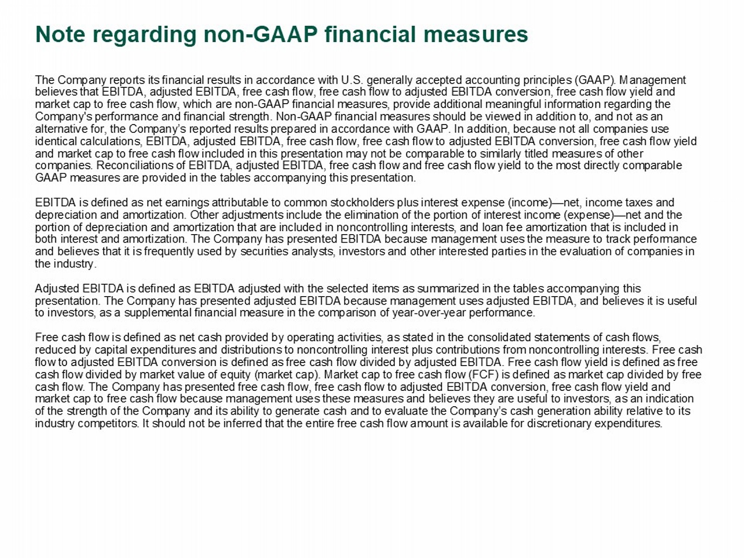Note regarding non - GAAP financial measures The Company reports its financial results in accordance with U.S. generally accepted accounting principles (GAAP). Management believes that EBITDA, adjusted EBITDA, free cash flow, free cash flow to adjusted EBITDA conversion, free cash flow yield and market cap to free cash flow, which are non - GAAP financial measures, provide additional meaningful information regarding the Company's performance and financial strength. Non - GAAP financial measures should be viewed in addition to, and not as an alternative for, the Company’s reported results prepared in accordance with GAAP. In addition, because not all companies use identical calculations, EBITDA, adjusted EBITDA, free cash flow, free cash flow to adjusted EBITDA conversion, free cash flow yi eld and market cap to free cash flow included in this presentation may not be comparable to similarly titled measures of other companies. Reconciliations of EBITDA, adjusted EBITDA, free cash flow and free cash flow yield to the most directly comparabl e GAAP measures are provided in the tables accompanying this presentation. EBITDA is defined as net earnings attributable to common stockholders plus interest expense (income) — net, income taxes and depreciation and amortization. Other adjustments include the elimination of the portion of interest income (expense) — net and the portion of depreciation and amortization that are included in noncontrolling interests, and loan fee amortization that is inc lud ed in both interest and amortization. The Company has presented EBITDA because management uses the measure to track performance and believes that it is frequently used by securities analysts, investors and other interested parties in the evaluation of c omp anies in the industry. Adjusted EBITDA is defined as EBITDA adjusted with the selected items as summarized in the tables accompanying this presentation. The Company has presented adjusted EBITDA because management uses adjusted EBITDA, and believes it is useful to investors, as a supplemental financial measure in the comparison of year - over - year performance. Free cash flow is defined as net cash provided by operating activities, as stated in the consolidated statements of cash flow s, reduced by capital expenditures and distributions to noncontrolling interest plus contributions from noncontrolling interests . F ree cash flow to adjusted EBITDA conversion is defined as free cash flow divided by adjusted EBITDA. Free cash flow yield is defined a s f ree cash flow divided by market value of equity (market cap). Market cap to free cash flow (FCF) is defined as market cap divided by free cash flow. The Company has presented free cash flow, free cash flow to adjusted EBITDA conversion, free cash flow yield and market cap to free cash flow because management uses these measures and believes they are useful to investors, as an indicati on of the strength of the Company and its ability to generate cash and to evaluate the Company’s cash generation ability relativ e t o its industry competitors. It should not be inferred that the entire free cash flow amount is available for discretionary expendit ure s.