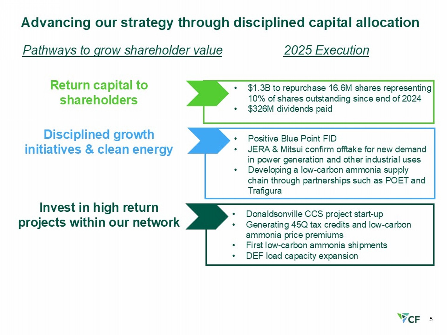 4 Constructive global nitrogen dynamics and operational excellence deliver strong results (1) See appendix for reconciliation of adjusted EBITDA to the most directly comparable GAAP measure (2) Represents last twelve months share repurchases and dividends paid through December 31, 2025 (3) Includes the cash inflows and outflows associated with the Blue Point joint venture, which includes a net cash inflow of ~$10 0M representing contributions from JERA and Mitsui ($291M) less Capex funded by JERA and Mitsui (60% of $307M). See appendix for reconciliation of free cash flow to the most di rec tly comparable GAAP measure (4) As of December 31, 2025; share repurchase authorization runs through 2029 (5) Per 200,000 work hours as of December 31, 2025 (6) Represents FY 2025 free cash flow divided by FY 2025 adjusted EBITDA. See appendix for reconciliations of free cash flow and adj usted EBITDA to the most directly comparable GAAP measures (7) Sourced from CRU Ammonia Database on December 22, 2025 97% FY 2025 Capacity Utilization 0.26 FY 2025 Recordable Incident Rate (5) 62% FY 2025 FCF/Adj EBITDA Conversion (6) $821M Q4 2025 Adjusted EBITDA (1) $ 2.9 B FY 2025 Adjusted EBITDA (1) $2 .8 B FY 2025 Cash from Operations $1.8B FY 2025 Free Cash Flow (3) $1.7B FY 2025 Capital Returned to Shareholders (2) $ 1 .7B Remaining in Current $2B Share Repurchase Authorization (4) $ 1.5B FY 2025 Net Earnings $404 M Q4 2025 Net Earnings 10% Greater Capacity Utilization than North America Peers (7) 5 - year rolling average ending 2025