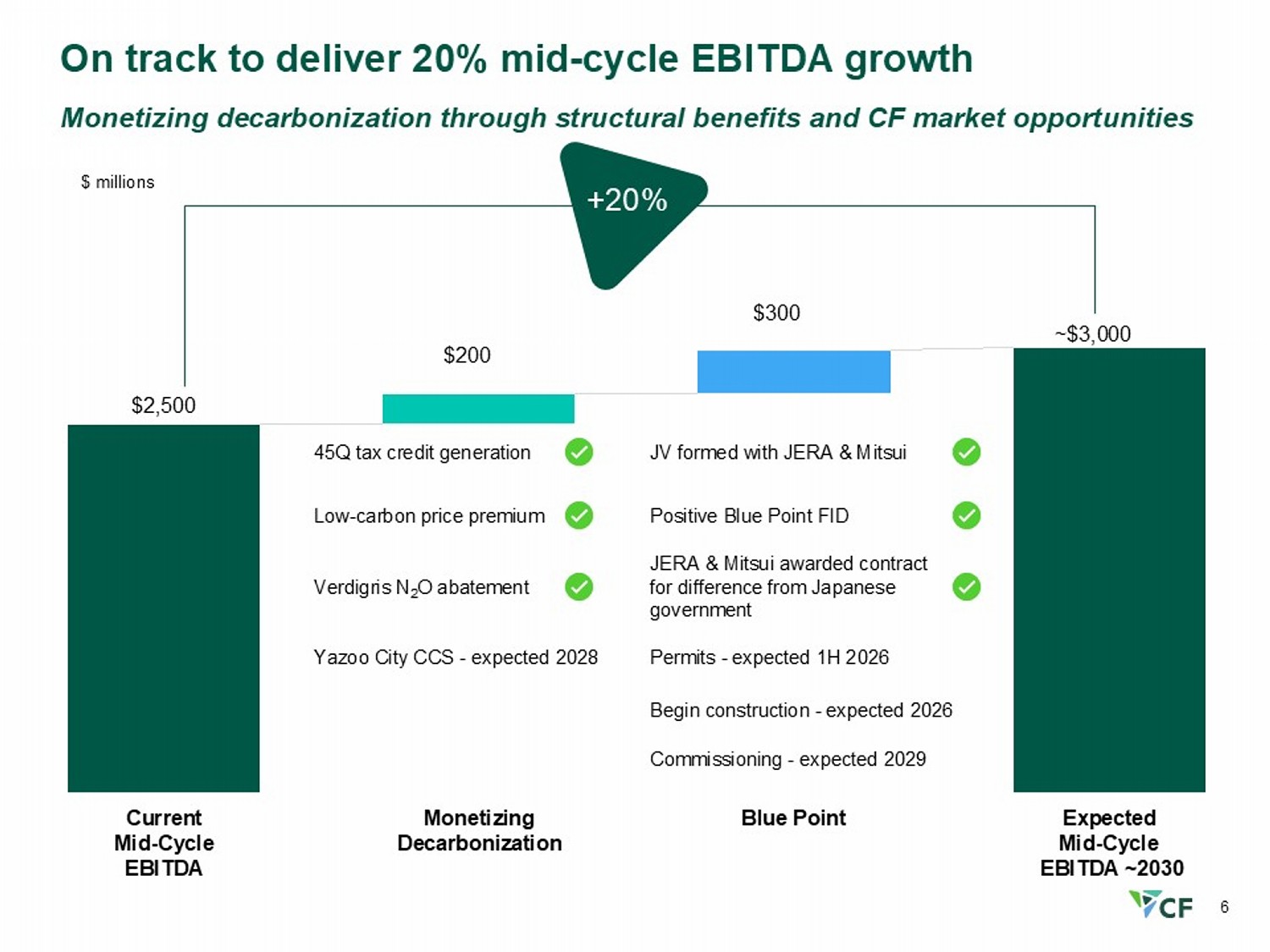 5 Advancing our strategy through disciplined capital allocation Pathways to grow shareholder value Return capital to shareholders Disciplined growth initiatives & clean energy Invest in high return projects within our network 2025 Execution • Positive Blue Point FID • JERA & Mitsui confirm offtake for new demand in power generation and other industrial uses • Developing a low - carbon ammonia supply chain through partnerships such as POET and Trafigura • $1.3B to repurchase 16.6M shares representing 10% of shares outstanding since end of 2024 • $326M dividends paid • Donaldsonville CCS project start - up • Generating 45Q tax credits and low - carbon ammonia price premiums • First low - carbon ammonia shipments • DEF load capacity expansion