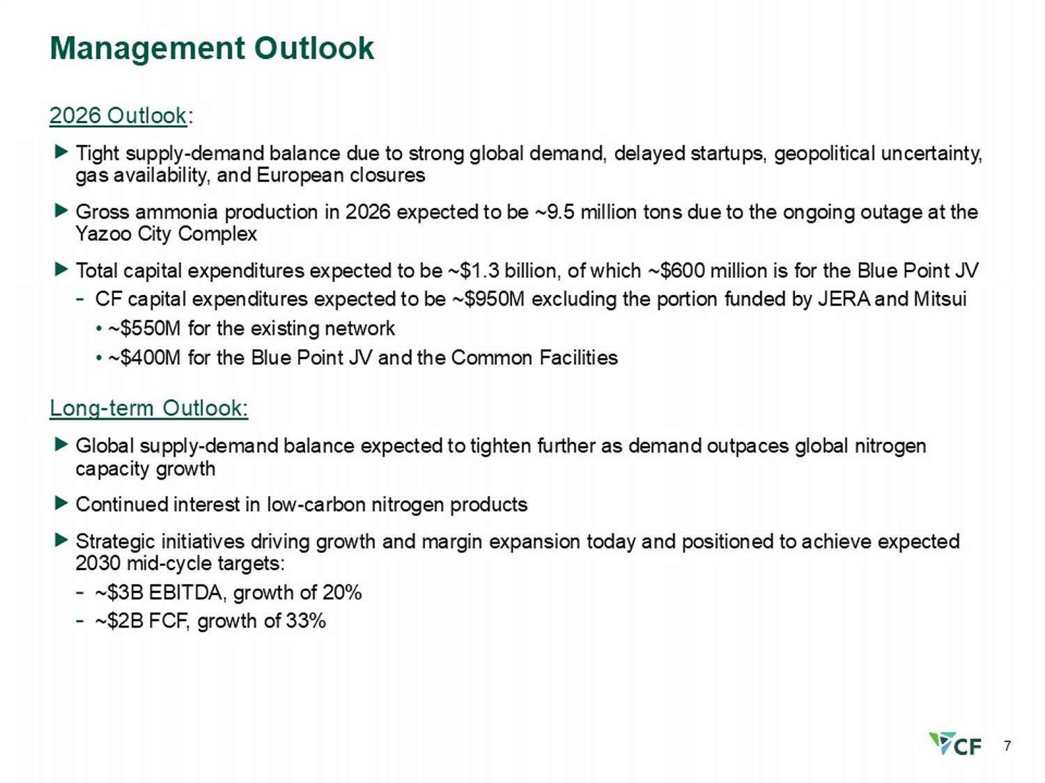 6 On track to deliver 20% mid - cycle EBITDA growth Current Mid - Cycle EBITDA Monetizing Decarbonization Blue Point Expected Mid - Cycle EBITDA ~2030 $ millions +20% $2,500 $200 $300 ~$3,000 45Q tax credit generation Low - carbon price premium Verdigris N 2 O abatement Yazoo City CCS - expected 2028 Positive Blue Point FID JV formed with JERA & Mitsui Monetizing decarbonization through structural benefits and CF market opportunities Permits - expected 1H 2026 Commissioning - expected 2029 Begin construction - expected 2026 JERA & Mitsui awarded contract for difference from Japanese government