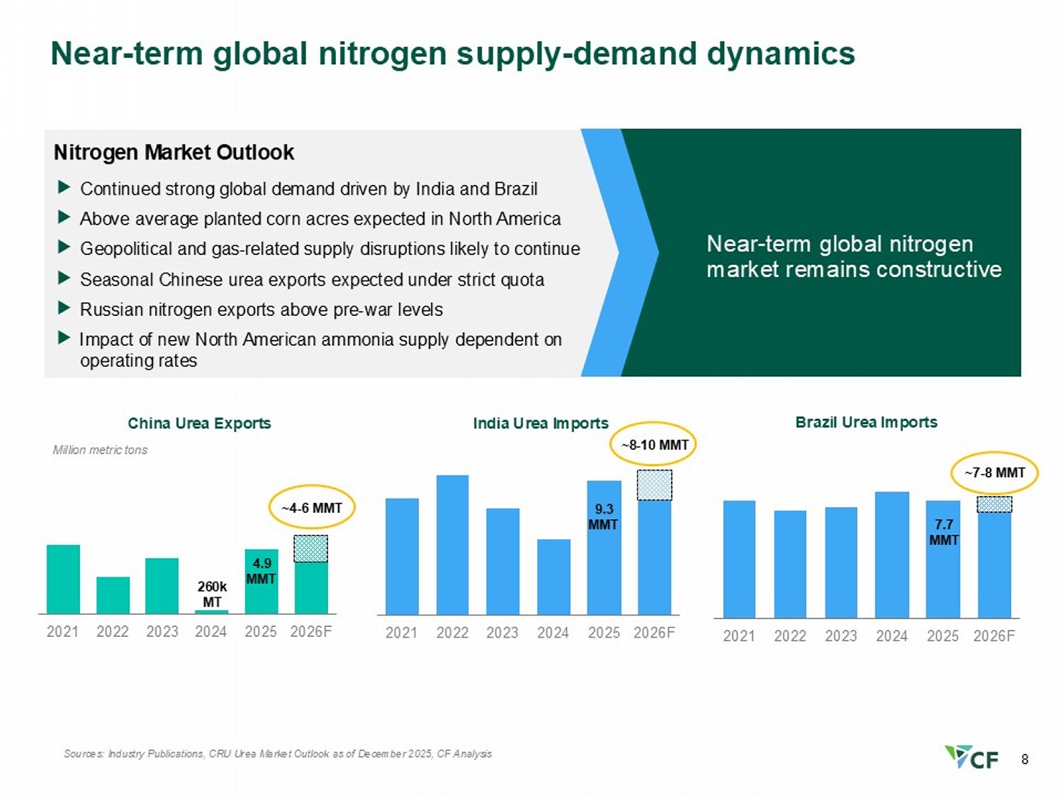 7 Management Outlook 2026 Outlook : Tight supply - demand balance due to strong global demand, delayed startups, geopolitical uncertainty, gas availability, and European closures Gross ammonia production in 2026 expected to be ~9.5 million tons due to the ongoing outage at the Yazoo City Complex Total capital expenditures expected to be ~$1.3 billion, of which ~$600 million is for the Blue Point JV - CF capital expenditures expected to be ~$950M excluding the portion funded by JERA and Mitsui • ~$550M for the existing network • ~$400M for the Blue Point JV and the Common Facilities Long - term Outlook: Global supply - demand balance expected to tighten further as demand outpaces global nitrogen capacity growth Continued interest in low - carbon nitrogen products Strategic initiatives driving growth and margin expansion today and positioned to achieve expected 2030 mid - cycle targets: - ~$3B EBITDA, growth of 20% - ~$2B FCF, growth of 33%