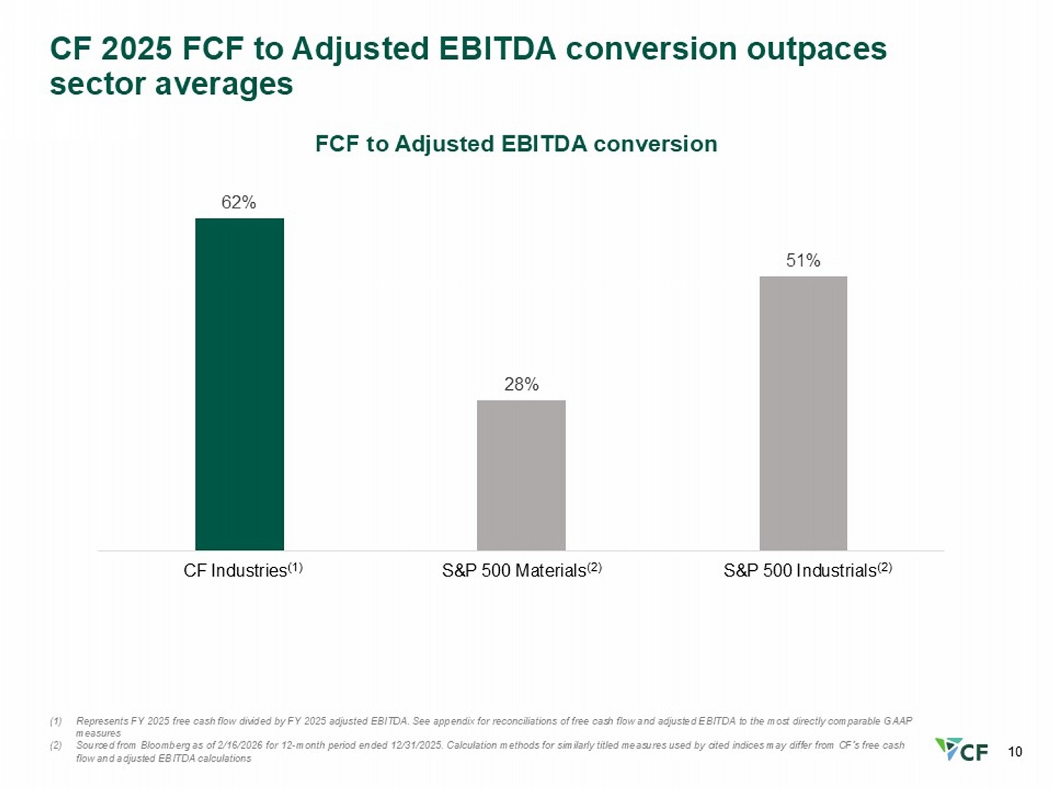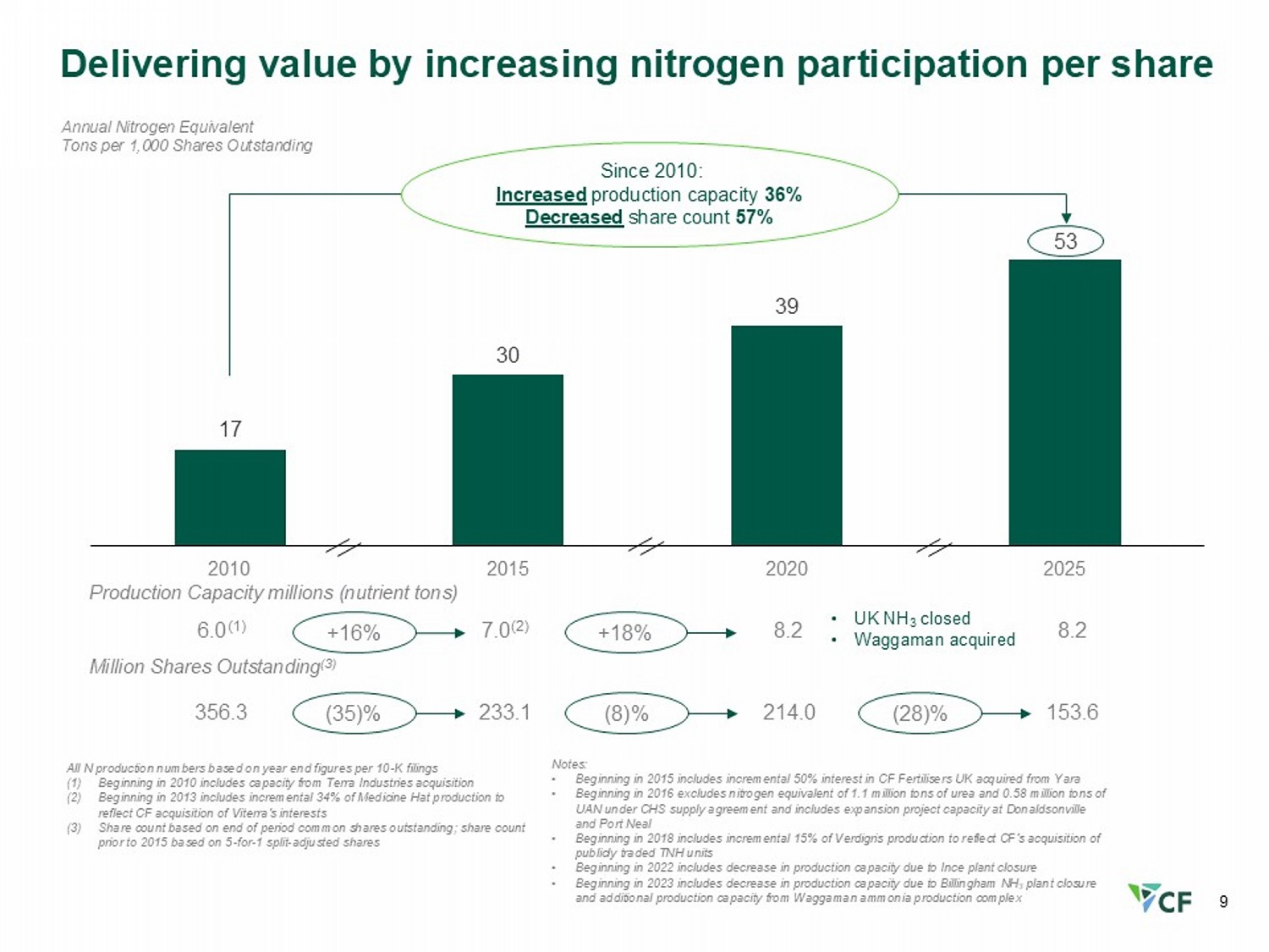 9 17 30 39 2010 2015 2020 2025 8.2 8.2 7.0 (2) 6.0 (1) Production Capacity millions (nutrient tons) Annual Nitrogen Equivalent Tons per 1,000 Shares Outstanding Delivering value by increasing nitrogen participation per share Million Shares Outstanding (3) Since 2010: Increased production capacity 36% Decreased share count 57% 153.6 214.0 233.1 356.3 +16% (35)% +18% (8)% (28)% • UK NH 3 closed • Waggaman acquired Notes: • Beginning in 2015 includes incremental 50% interest in CF Fertilisers UK acquired from Yara • Beginning in 2016 excludes nitrogen equivalent of 1.1 million tons of urea and 0.58 million tons of UAN under CHS supply agreement and includes expansion project capacity at Donaldsonville and Port Neal • Beginning in 2018 includes incremental 15% of Verdigris production to reflect CF’s acquisition of publicly traded TNH units • Beginning in 2022 includes decrease in production capacity due to Ince plant closure • Beginning in 2023 includes decrease in production capacity due to Billingham NH 3 plant closure and additional production capacity from Waggaman ammonia production complex All N production numbers based on year end figures per 10 - K filings (1) Beginning in 2010 includes capacity from Terra Industries acquisition (2) Beginning in 2013 includes incremental 34% of Medicine Hat production to reflect CF acquisition of Viterra's interests (3) Share count based on end of period common shares outstanding; share count prior to 2015 based on 5 - for - 1 split - adjusted shares 53