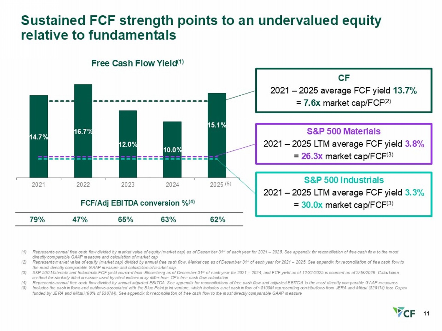 10 62% 28% 51% CF Industries… S&P 500 Materials… S&P 500 Industrials… CF 2025 FCF to Adjusted EBITDA conversion outpaces sector averages FCF to Adjusted EBITDA conversion (1) Represents FY 2025 free cash flow divided by FY 2025 adjusted EBITDA . S ee appendix for reconciliations of free cash flow and adjusted EBITDA to the most directly comparable GAAP measures (2) Sourced from Bloomberg as of 2/16/2026 for 12 - month period ended 12/31/2025 . Calculation methods for similarly titled measures used by cited indices may differ from CF’s free cash flow and adjusted EBITDA calculations CF Industries (1) S&P 500 Materials (2) S&P 500 Industrials (2)