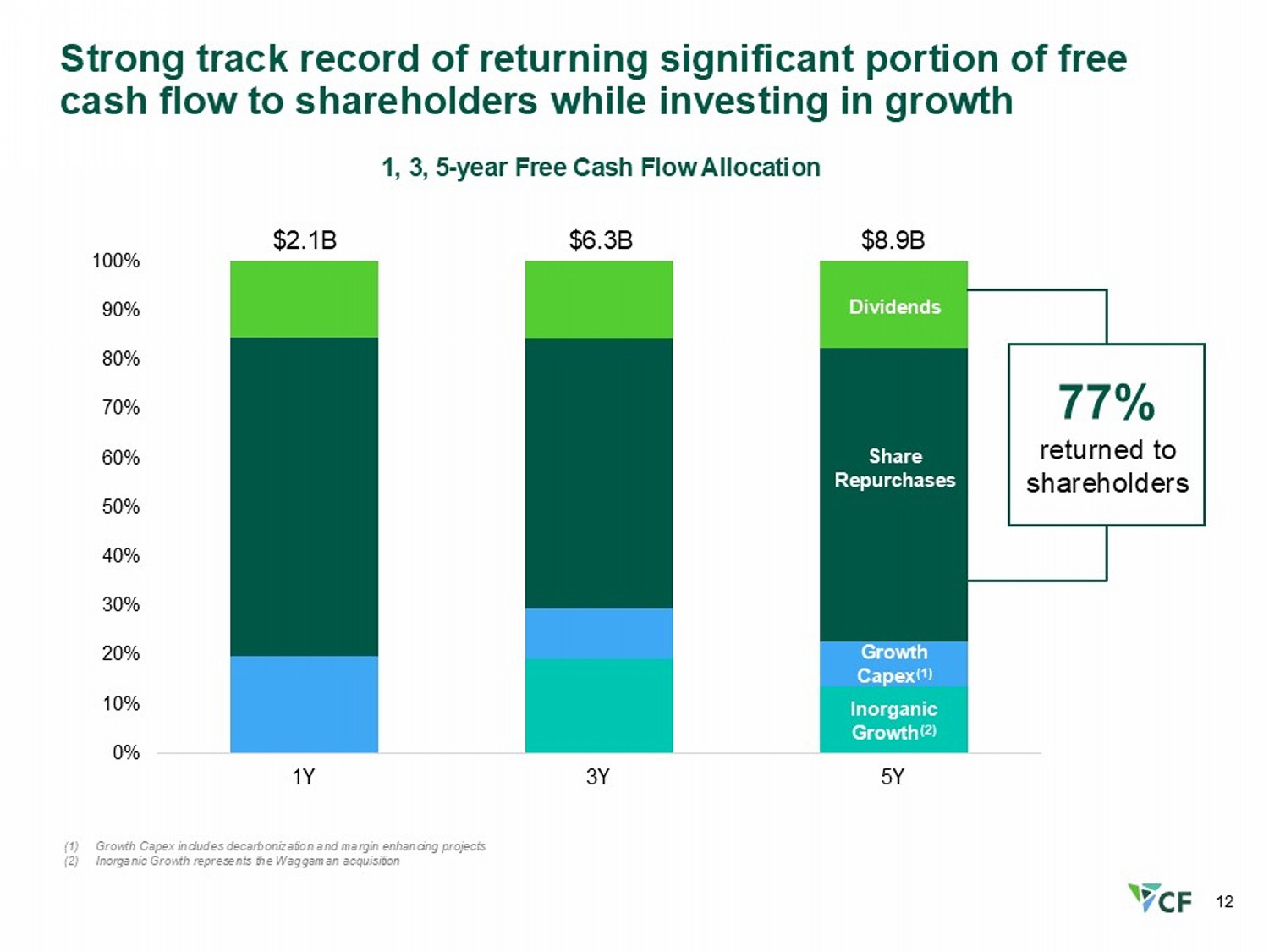 11 14.7% 16.7% 12.0% 10.0% 15.1% 2021 2022 2023 2024 2025 Sustained FCF strength points to an undervalued equity relative to fundamentals Free Cash Flow Yield (1) FCF/Adj EBITDA conversion % (4) 62% 63% 65% 47% 79% (1) Represents annual free cash flow divided by market value of equity (market cap) as of December 31 st of each year for 2021 – 2025. See appendix for reconciliation of free cash flow to the most directly comparable GAAP measure and calculation of market cap (2) Represents market value of equity (market cap) divided by annual free cash flow. Market cap as of December 31 st of each year for 2021 – 2025. See appendix for reconciliation of free cash flow to the most directly comparable GAAP measure and calculation of market cap. (3) S&P 500 Materials and Industrials FCF yield sourced from Bloomberg as of December 31 st of each year for 2021 – 2024, and FCF yield as of 12/31/2025 is sourced as of 2/16/2026. Calculation method for similarly titled measure used by cited indices may differ from CF’s free cash flow calculation (4) Represents annual free cash flow divided by annual adjusted EBITDA . S ee appendix for reconciliations of free cash flow and adjusted EBITDA to the most directly comparable GAAP measures (5) Includes the cash inflows and outflows associated with the Blue Point joint venture, which includes a net cash inflow of ~$10 0M representing contributions from JERA and Mitsui ($291M) less Capex funded by JERA and Mitsui (60% of $307M). See appendix for reconciliation of free cash flow to the most directly comparable G AAP measure (5) S&P 500 Materials 2021 – 2025 LTM average FCF yield 3.8% = 26.3x market cap/FCF (3) S&P 500 Industrials 2021 – 2025 LTM average FCF yield 3.3% = 30.0x market cap/FCF (3) CF 2021 – 2025 average FCF yield 13.7% = 7.6x market cap/FCF (2)
