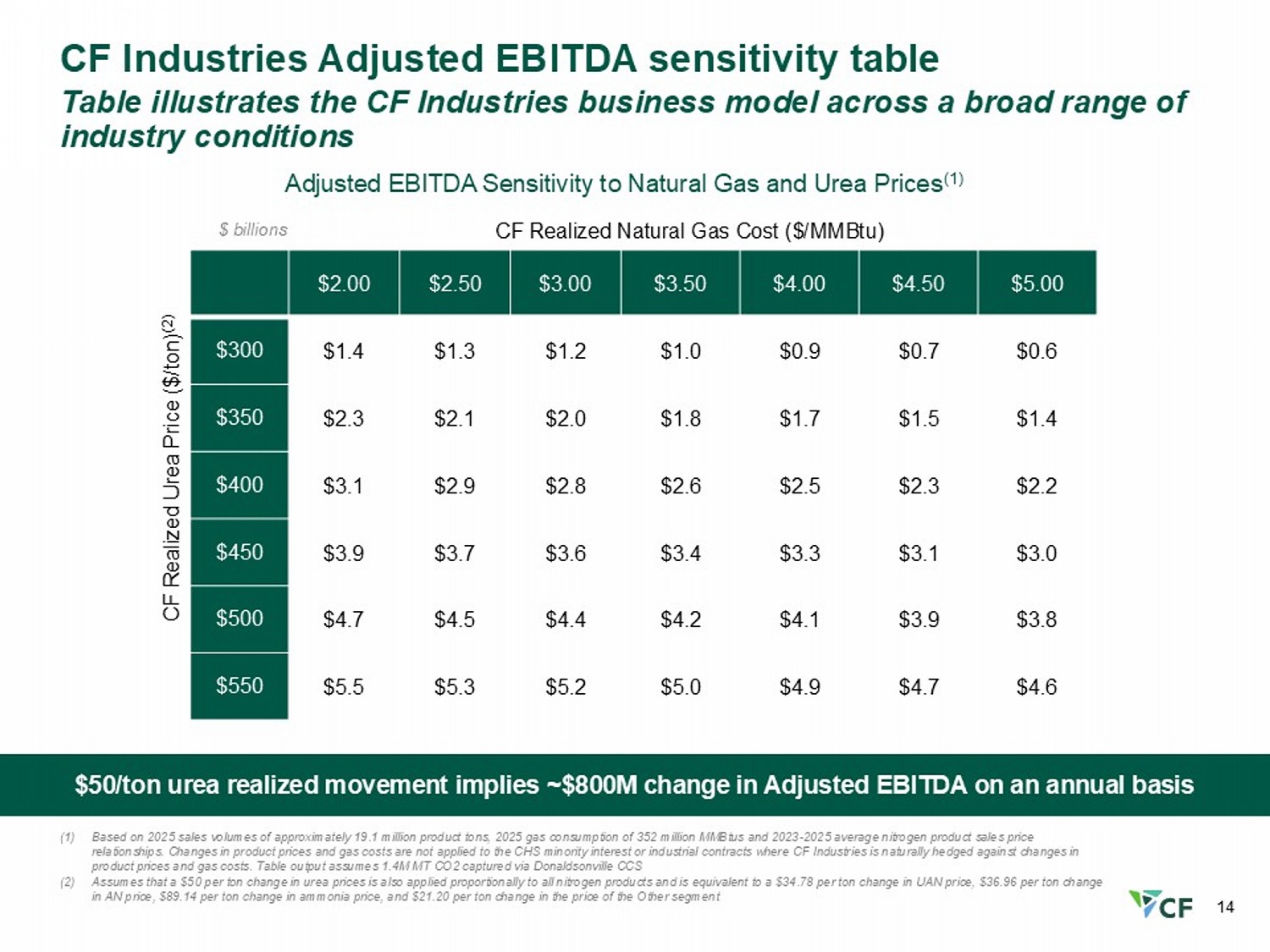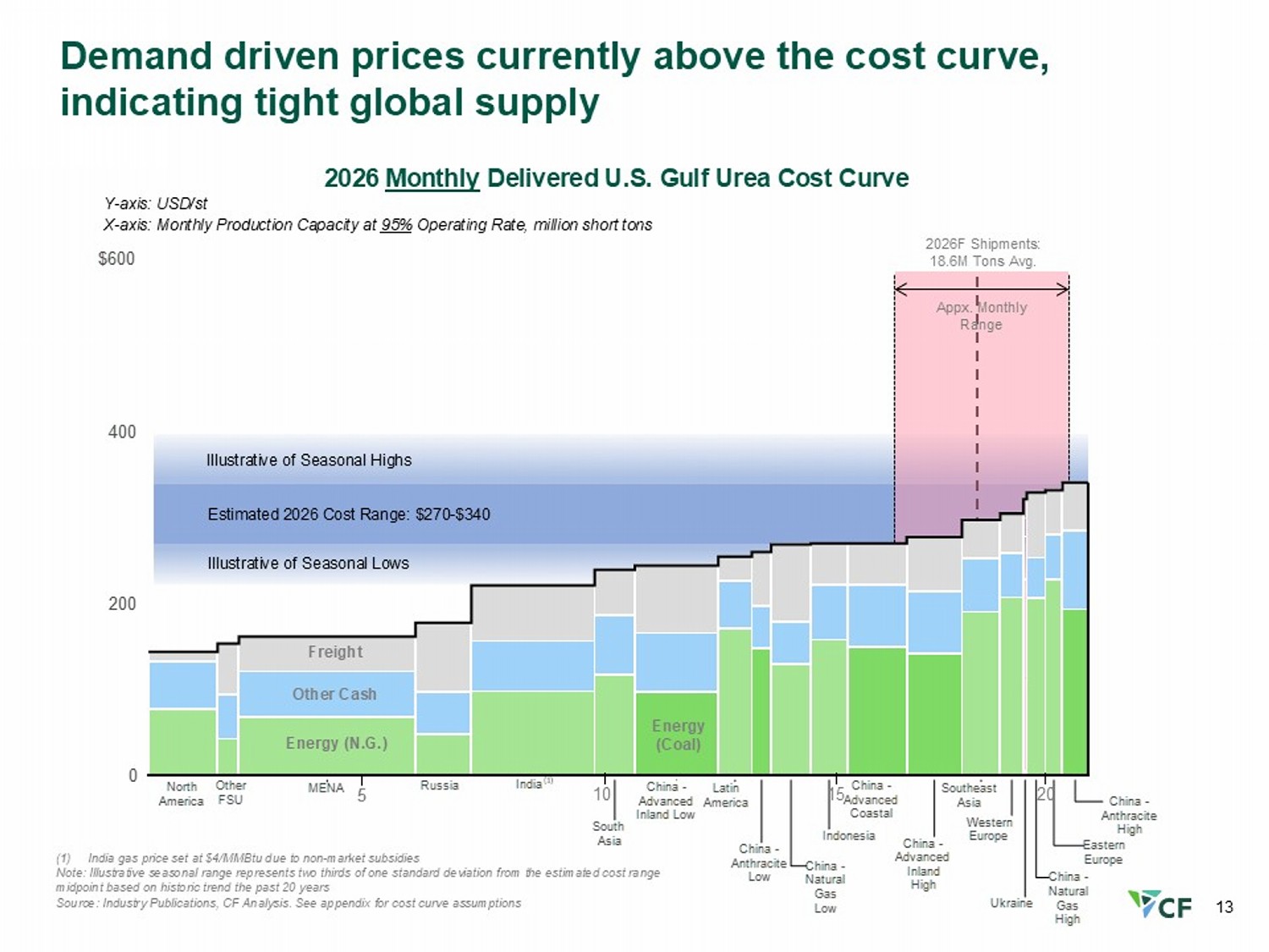 13 Highly Confidential 0 200 400 $600 North America Other FSU MENA Russia India South Asia China - Advanced Inland Low Latin America China - Anthracite Low China - Natural Gas Low Indonesia China - Advanced Coastal China - Advanced Inland High Southeast Asia Western Europe Ukraine China - Natural Gas High Eastern Europe China - Anthracite High Estimated 2026 Cost Range: $270 - $340 Illustrative of Seasonal H ighs Illustrative of S easonal Lows 2026F Shipments: 18.6M Tons Avg. Appx. Monthly Range Demand driven prices currently above the cost curve, indicating tight global supply 2026 Monthly Delivered U.S. Gulf Urea Cost Curve Y - axis: USD/ st X - axis: Monthly Production Capacity at 95% Operating Rate, million short tons 15 5 10 5 Energy (N.G.) Other Cash Freight Energy (Coal) 20 (1) India gas price set at $4/MMBtu due to non - market subsidies Note: Illustrative seasonal range represents two thirds of one standard deviation from the estimated cost range midpoint based on historic trend the past 20 years Source: Industry Publications, CF Analysis. See appendix for cost curve assumptions (1)