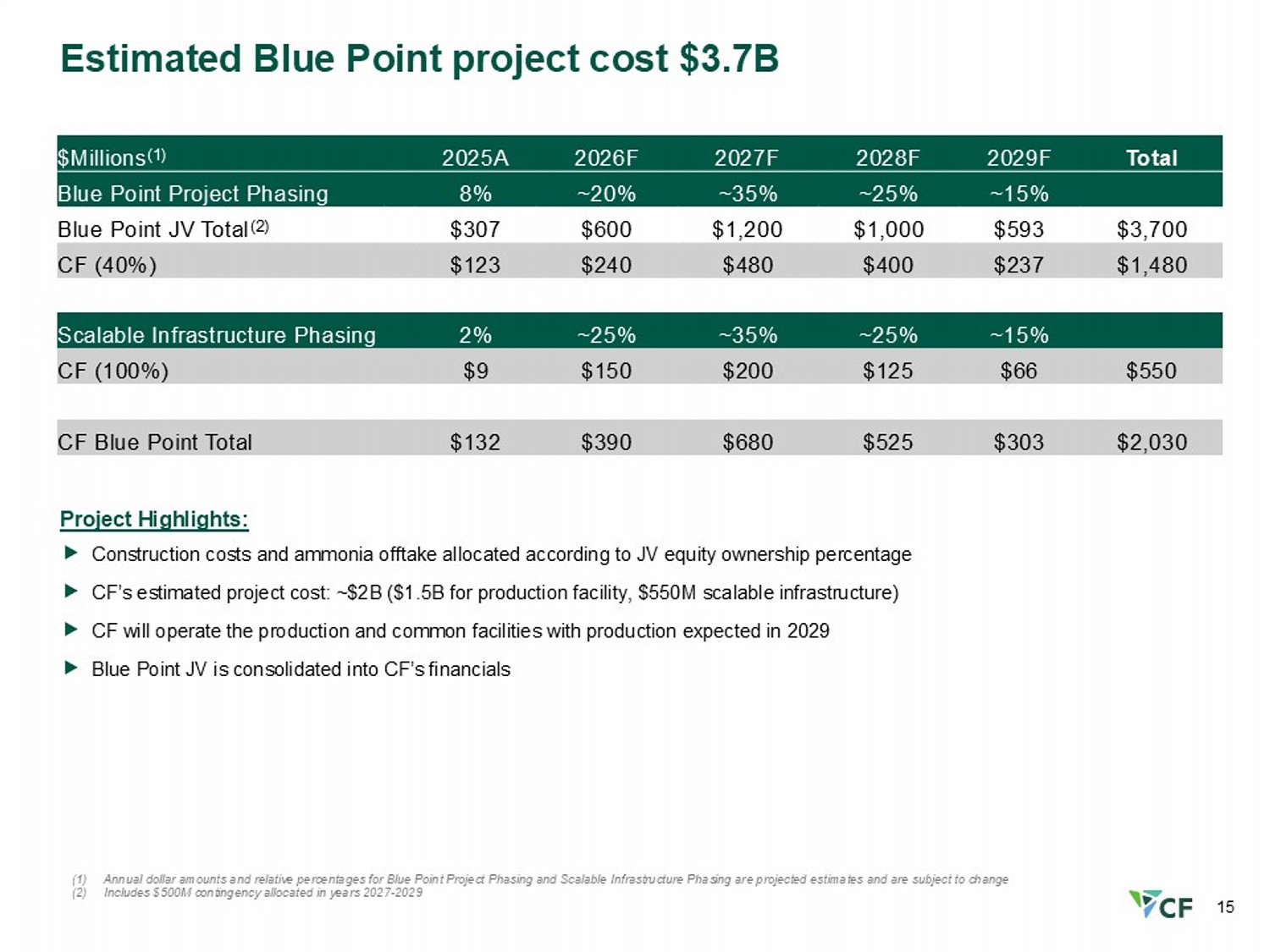 14 $5.00 $4.50 $4.00 $3.50 $3.00 $2.50 $2.00 $0.6 $0.7 $0.9 $1.0 $1.2 $1.3 $1.4 $300 $1.4 $1.5 $1.7 $1.8 $2.0 $2.1 $2.3 $350 $2.2 $2.3 $2.5 $2.6 $2.8 $2.9 $3.1 $400 $3.0 $3.1 $3.3 $3.4 $3.6 $3.7 $3.9 $450 $3.8 $3.9 $4.1 $4.2 $4.4 $4.5 $4.7 $500 $4.6 $4.7 $4.9 $5.0 $5.2 $5.3 $5.5 $550 CF Industries Adjusted EBITDA sensitivity table Table illustrates the CF Industries business model across a broad range of industry conditions $50/ton urea realized movement implies ~$800M change in Adjusted EBITDA on an annual basis (1) Based on 2025 sales volumes of approximately 19.1 million product tons, 2025 gas consumption of 352 million MMBtus and 2023 - 2025 average nitrogen product sales price relationships. Changes in product prices and gas costs are not applied to the CHS minority interest or industrial contracts w her e CF Industries is naturally hedged against changes in product prices and gas costs. Table output assumes 1.4M MT CO2 captured via Donaldsonville CCS (2) Assumes that a $50 per ton change in urea prices is also applied proportionally to all nitrogen products and is equivalent to a $34.78 per ton change in UAN price, $36.96 per ton change in AN price, $89.14 per ton change in ammonia price, and $21.20 per ton change in the price of the Other segment Adjusted EBITDA Sensitivity to Natural Gas and Urea Prices (1) $ billions CF Realized Natural Gas Cost ($/MMBtu) CF Realized Urea Price ($/ton) (2)