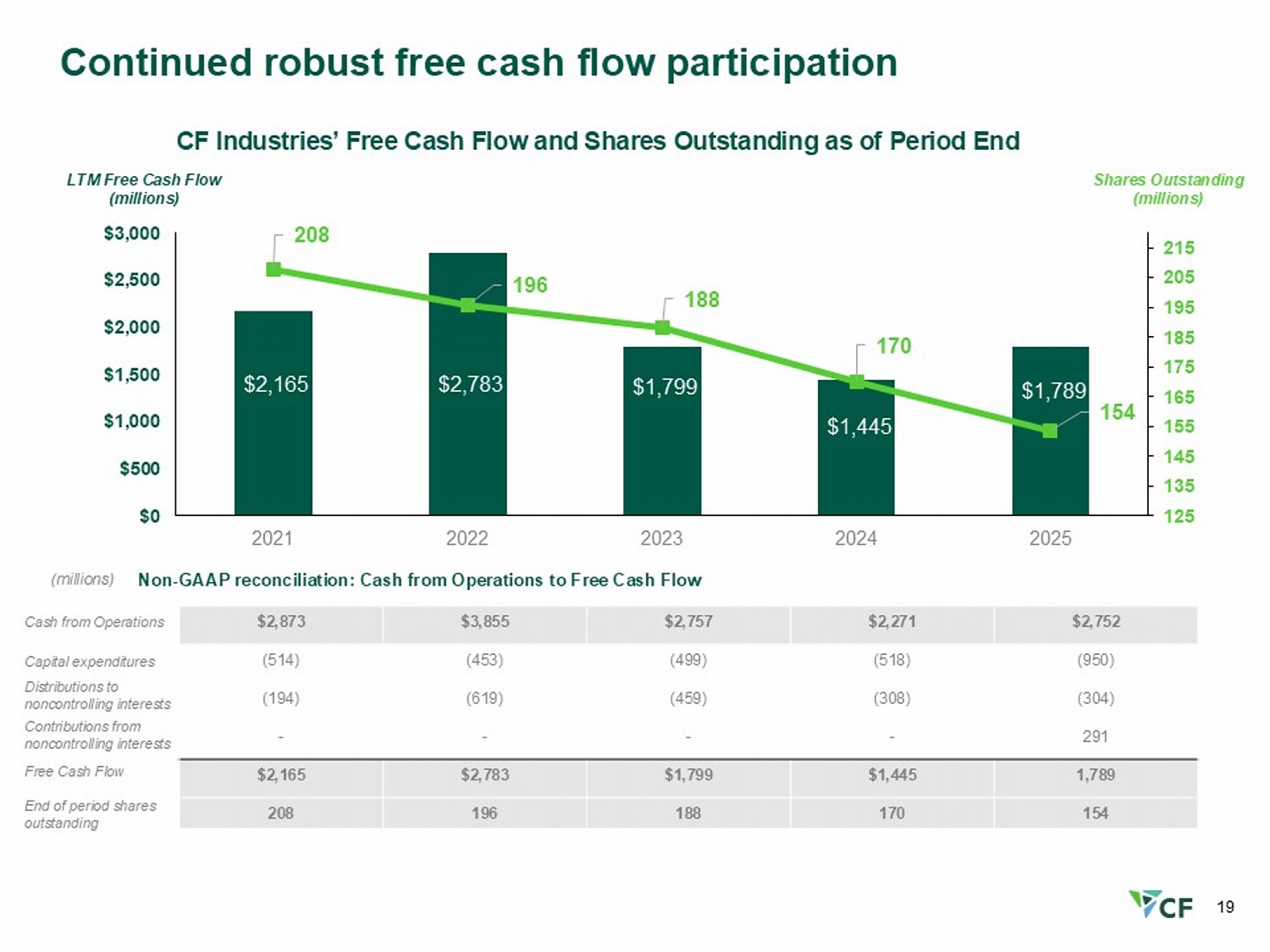 18 Strong cash generation with significant return to shareholders (1) Represents the cash and cash equivalents balance on the Company's Consolidated Balance Sheet at the end of each respective pe rio d (2) Consists of 60% the total Blue Point JV capex of ~$94M of Blue Point JV capex in Q4 2025 and $307M in FY 2025 (3) Includes Blue Point JV capex of ~$38M in Q4 2025 and $123M in FY 2025, which represents the 40% attributable to CF (4) Represents share repurchases and dividends paid in Q4 2025 and FY 2025 as reflected on the Company’s Consolidated Statements of Cash Flows (5) Includes issuance in November 2025 of $1.0 billion aggregate principal amount of 5.300% senior notes due 2035 and redemption in December 2025 of $750 million outstanding principal amount of 4.500% senior secured notes due 2026 (6) Semi - annual distribution(s) paid to noncontrolling interest (CHS Inc.) in FY 2025 $1,838 Cash Q3 2025 (1) Cash from Operations Return to Shareholders (4) Other (5) Cash Q4 2025 (1) $1,982 $( 423 ) $539 $(56) Cash 2024 (1) Cash from Operations CHS Distributions (6) Return to Shareholders (4) Other (5) Cash 2025 (1) JERA & Mitsui Blue Point JV Capital Contributions $1,614 $2,752 $291 $(766) $(304) $(1,691) $1,982 $ millions $ millions Q4 2025 Cash Sources and Uses FY 2025 Cash Sources and Uses $254 $ 270 $(170 ) $( 184) Capex Funded by JERA & Mitsui (2) Funded by CF (3) Capex Funded by JERA & Mitsui (2) Funded by CF (3) $(226) $(950) Consolidated CF Capex Consolidated CF Capex