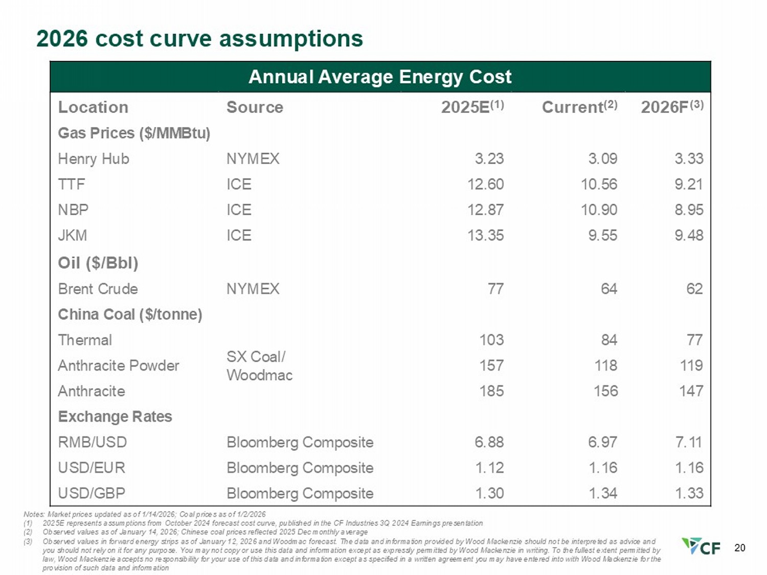 20 Annual Average Energy Cost 2026F (3) Current (2) 2025E (1) Source Location Gas Prices ($/MMBtu) 3.33 3.09 3.23 NYMEX Henry Hub 9.21 10.56 12.60 ICE TTF 8.95 10.90 12.87 ICE NBP 9.48 9.55 13.35 ICE JKM Oil ($/ Bbl ) 62 64 77 NYMEX Brent Crude China Coal ($/ tonne ) 77 84 103 SX Coal/ Woodmac Thermal 119 118 157 Anthracite Powder 147 156 185 Anthracite Exchange Rates 7.11 6.97 6.88 Bloomberg Composite RMB/USD 1.16 1.16 1.12 Bloomberg Composite USD/EUR 1.33 1.34 1.30 Bloomberg Composite USD/GBP Notes: Market prices updated as of 1/14/2026; Coal prices as of 1/2/2026 (1) 2025E represents assumptions from October 2024 forecast cost curve, published in the CF Industries 3Q 2024 Earnings presentat ion (2) Observed values as of January 14, 2026; Chinese coal prices reflected 2025 Dec monthly average (3) Observed values in forward energy strips as of January 12, 2026 and Woodmac forecast. The data and information provided by Wood Mackenzie should not be interpreted as advice and you should not rely on it for any purpose. You may not copy or use this data and information except as expressly permitted by Wo od Mackenzie in writing. To the fullest extent permitted by law, Wood Mackenzie accepts no responsibility for your use of this data and information except as specified in a written agre eme nt you may have entered into with Wood Mackenzie for the provision of such data and information 2026 cost curve assumptions