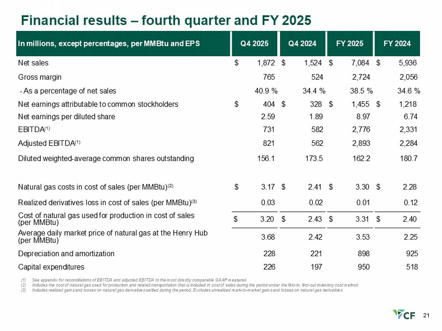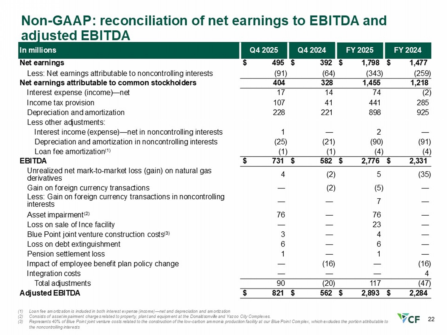 21 Financial results – fourth quarter and FY 2025 FY 2024 FY 2025 Q4 2024 Q4 2025 In millions, except percentages, per MMBtu and EPS $ 5,936 $ 7,084 $ 1,524 $ 1,872 Net sales 2,056 2,724 524 765 Gross margin 34.6 % 38.5 % 34.4 % 40.9 % - As a percentage of net sales $ 1,218 $ 1,455 $ 328 $ 404 Net earnings attributable to common stockholders 6.74 8.97 1.89 2.59 Net earnings per diluted share 2,331 2,776 582 731 EBITDA (1) 2,284 2,893 562 821 Adjusted EBITDA (1) 180.7 162.2 173.5 156.1 Diluted weighted - average common shares outstanding $ 2.28 $ 3.30 $ 2.41 $ 3.17 Natural gas costs in cost of sales (per MMBtu) (2) 0.12 0.01 0.02 0.03 Realized derivatives loss in cost of sales (per MMBtu) (3) Cost of natural gas used for production in cost of sales (per MMBtu) $ 3.20 $ 2.43 $ 3.31 $ 2.40 2.25 3.53 2.42 3.68 Average daily market price of natural gas at the Henry Hub (per MMBtu) 925 898 221 228 Depreciation and amortization 518 950 197 226 Capital expenditures (1) See appendix for reconciliations of EBITDA and adjusted EBITDA to the most directly comparable GAAP measures (2) Includes the cost of natural gas used for production and related transportation that is included in cost of sales during the period under the first - in, first - out inventory cost method (3) Includes realized gains and losses on natural gas derivatives settled during the period. Excludes unrealized mark - to - market gains and losses on natural gas derivatives