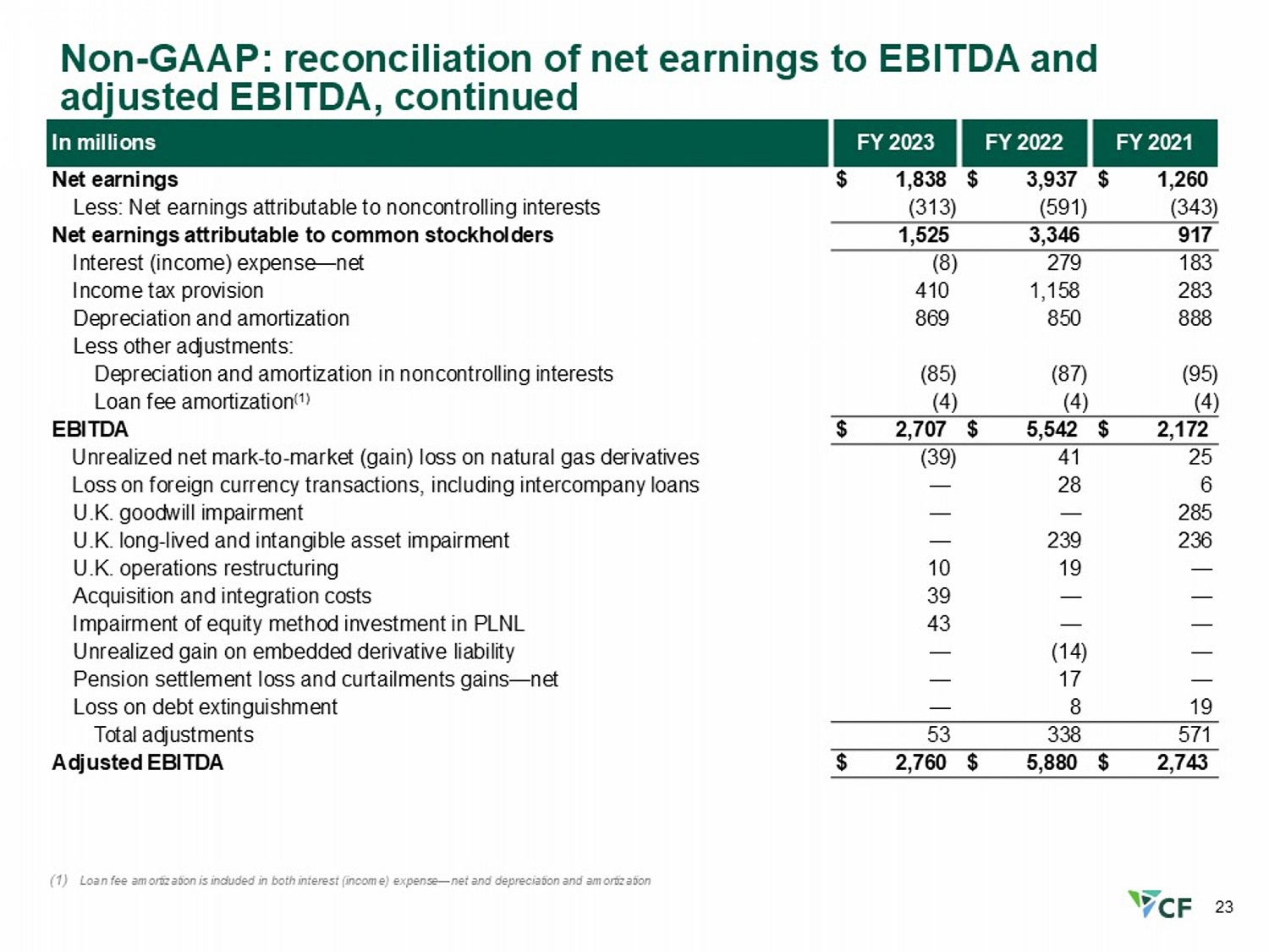 22 FY 2024 FY 2025 Q4 2024 Q4 2025 In millions $ 1,477 $ 1,798 $ 392 $ 495 Net earnings (259) (343) (64) (91) Less: Net earnings attributable to noncontrolling interests 1,218 1,455 328 404 Net earnings attributable to common stockholders (2) 74 14 17 Interest expense (income) — net 285 441 41 107 Income tax provision 925 898 221 228 Depreciation and amortization Less other adjustments: — 2 — 1 Interest income (expense) — net in noncontrolling interests (91) (90) (21) (25) Depreciation and amortization in noncontrolling interests (4) (4) (1) (1) Loan fee amortization (1) $ 2,331 $ 2,776 $ 582 $ 731 EBITDA (35) 5 (2) 4 Unrealized net mark - to - market loss (gain) on natural gas derivatives — (5) (2) — Gain on foreign currency transactions — 7 — — Less: Gain on foreign currency transactions in noncontrolling interests — 76 — 76 Asset impairment (2) — 23 — — Loss on sale of Ince facility — 4 — 3 Blue Point joint venture construction costs (3) — 6 — 6 Loss on debt extinguishment — 1 — 1 Pension settlement loss (16) — (16) — Impact of employee benefit plan policy change 4 — — — Integration costs (47) 117 (20) 90 Total adjustments $ 2,284 $ 2,893 $ 562 $ 821 Adjusted EBITDA Non - GAAP: reconciliation of net earnings to EBITDA and adjusted EBITDA (1) Loan fee amortization is included in both interest expense (income) — net and depreciation and amortization (2) Consists of asset impairment charges related to property, plant and equipment at the Donaldsonville and Yazoo City Complexes. (3) Represents 40% of Blue Point joint venture costs related to the construction of the low - carbon ammonia production facility at our Blue Point Complex, which excludes the portion attributable to the noncontrolling interests