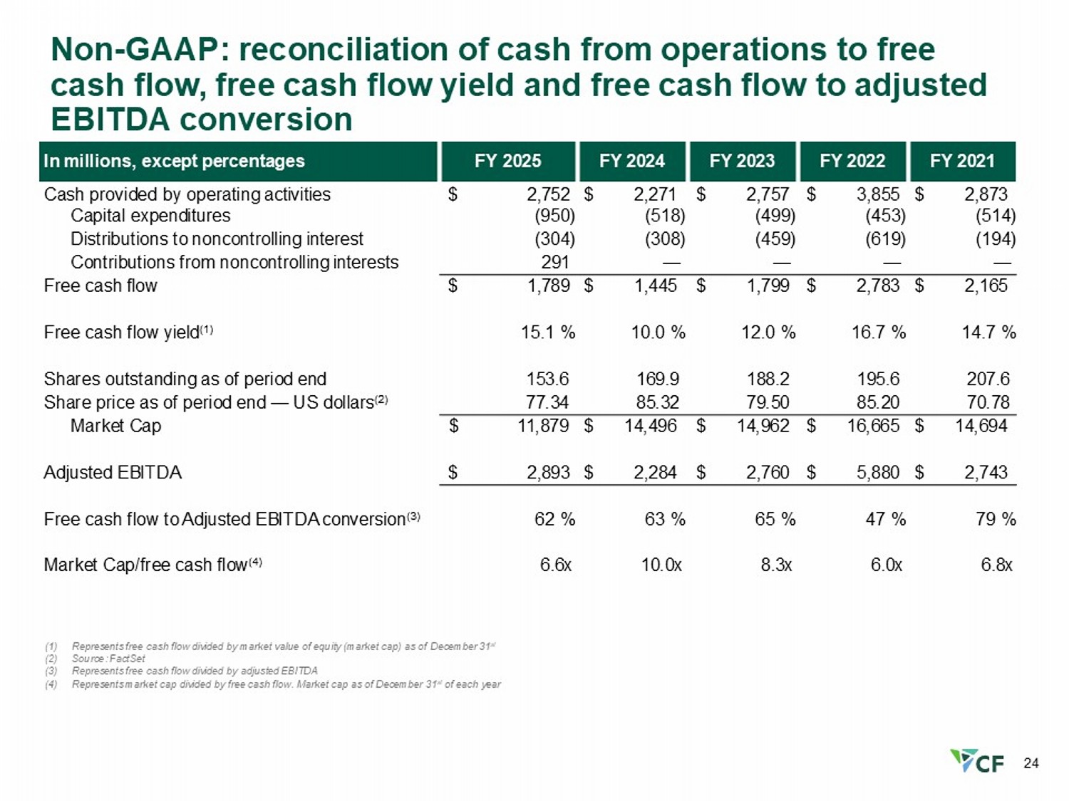 24 Non - GAAP: reconciliation of cash from operations to free cash flow, free cash flow yield and free cash flow to adjusted EBITDA conversion FY 2021 FY 2022 FY 2023 FY 2024 FY 2025 In millions, except percentages $ 2,873 $ 3,855 $ 2,757 $ 2,271 $ 2,752 Cash provided by operating activities (514) (453) (499) (518) (950) Capital expenditures (194) (619) (459) (308) (304) Distributions to noncontrolling interest — — — — 291 Contributions from noncontrolling interests $ 2,165 $ 2,783 $ 1,799 $ 1,445 $ 1,789 Free cash flow 14.7 % 16.7 % 12.0 % 10.0 % 15.1 % Free cash flow yield (1) 207.6 195.6 188.2 169.9 153.6 Shares outstanding as of period end 70.78 85.20 79.50 85.32 77.34 Share price as of period end — US dollars (2) $ 14,694 $ 16,665 $ 14,962 $ 14,496 $ 11,879 Market Cap $ 2,743 $ 5,880 $ 2,7 6 0 $ 2,284 $ 2,893 Adjusted EBITDA 79 % 47 % 65 % 63 % 62 % Free cash flow to Adjusted EBITDA conversion (3) 6.8x 6.0x 8.3x 10.0x 6.6x Market Cap/free cash flow (4) (1) Represents free cash flow divided by market value of equity (market cap) as of December 31 st (2) Source: FactSet (3) Represents free cash flow divided by adjusted EBITDA (4) Represents market cap divided by free cash flow. Market cap as of December 31 st of each year