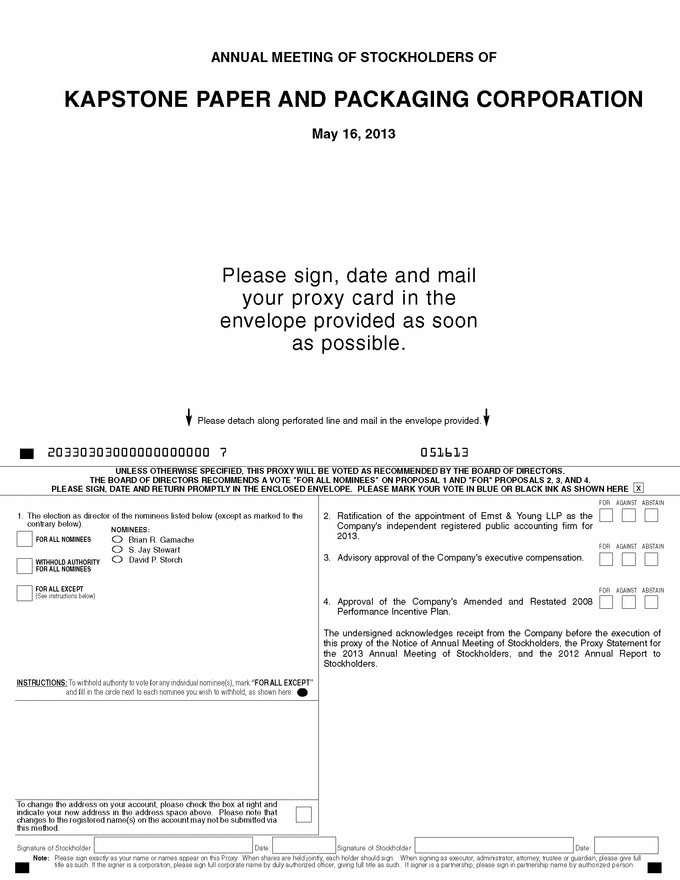 ANNUAL MEETING OF STOCKHOLDERS OF KAPSTONE PAPER AND PACKAGING CORPORATION May 16, 2013 NOTICE OF INTERNET AVAILABILITY OF PROXY MATERIAL: The Notice of Meeting, proxy statement and proxy card are available at - {Insert web address where material will be hosted} Please sign, date and mail your proxy card in the envelope provided as soon as possible. Signature of Stockholder Date: Signature of Stockholder Date: Note: Please sign exactly as your name or names appear on this Proxy. When shares are held jointly, each holder should sign. When signing as executor, administrator, attorney, trustee or guardian, please give full title as such. If the signer is a corporation, please sign full corporate name by duly authorized officer, giving full title as such. If signer is a partnership, please sign in partnership name by authorized person. To change the address on your account, please check the box at right and indicate your new address in the address space above. Please note that changes to the registered name(s) on the account may not be submitted via this method. 1. The election as director of the nominees listed below (except as marked to the contrary below). O Brian R. Gamache O S. Jay Stewart O David P. Storch 2. Ratification of the appointment of Ernst & Young LLP as the Company's independent registered public accounting firm for 2013. 3. Advisory approval of the Company's executive compensation. 4. Approval of the Company's Amended and Restated 2008 Performance Incentive Plan. The undersigned acknowledges receipt from the Company before the execution of this proxy of the Notice of Annual Meeting of Stockholders, the Proxy Statement for the 2013 Annual Meeting of Stockholders, and the 2012 Annual Report to Stockholders. FOR AGAINST ABSTAIN FOR ALL NOMINEES WITHHOLD AUTHORITY FOR ALL NOMINEES FOR ALL EXCEPT (See instructions below) INSTRUCTIONS: To withhold authority to vote for any individual nominee(s), mark “FOR ALL EXCEPT” and fill in the circle next to each nominee you wish to withhold, as shown here: NOMINEES: UNLESS OTHERWISE SPECIFIED, THIS PROXY WILL BE VOTED AS RECOMMENDED BY THE BOARD OF DIRECTORS. THE BOARD OF DIRECTORS RECOMMENDS A VOTE "FOR ALL NOMINEES" ON PROPOSAL 1 AND "FOR" PROPOSALS 2, 3, AND 4. PLEASE SIGN, DATE AND RETURN PROMPTLY IN THE ENCLOSED ENVELOPE. PLEASE MARK YOUR VOTE IN BLUE OR BLACK INK AS SHOWN HERE x Please detach along perforated line and mail in the envelope provided. --------------- ---------------- 20330303000000000000 7 051613 FOR AGAINST ABSTAIN FOR AGAINST ABSTAIN |