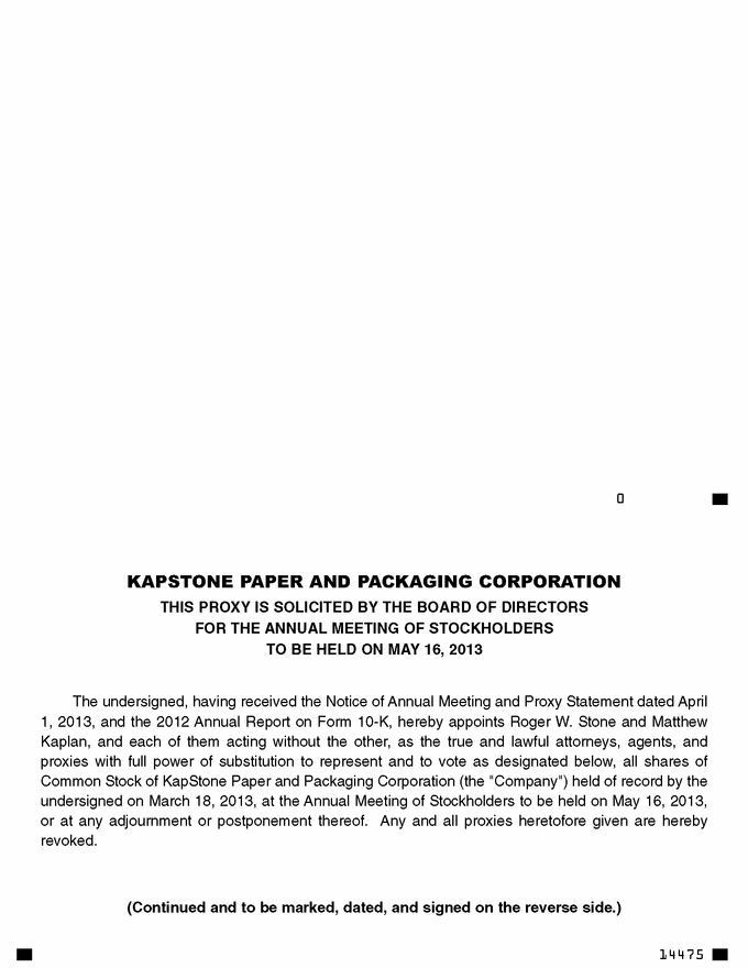 0 --------------- . . . . . . . . . . . . . . . . . . . . . . . . . . . . . . . . . . . . . . . . . . . . . . . . . . . . . . ---------------- 14475 KAPSTONE PAPER AND PACKAGING CORPORATION THIS PROXY IS SOLICITED BY THE BOARD OF DIRECTORS FOR THE ANNUAL MEETING OF STOCKHOLDERS TO BE HELD ON MAY 16, 2013 The undersigned, having received the Notice of Annual Meeting and Proxy Statement dated April 1, 2013, and the 2012 Annual Report on Form 10-K, hereby appoints Roger W. Stone and Matthew Kaplan, and each of them acting without the other, as the true and lawful attorneys, agents, and proxies with full power of substitution to represent and to vote as designated below, all shares of Common Stock of KapStone Paper and Packaging Corporation (the "Company") held of record by the undersigned on March 18, 2013, at the Annual Meeting of Stockholders to be held on May 16, 2013, or at any adjournment or postponement thereof. Any and all proxies heretofore given are hereby revoked. (Continued and to be marked, dated, and signed on the reverse side.) |