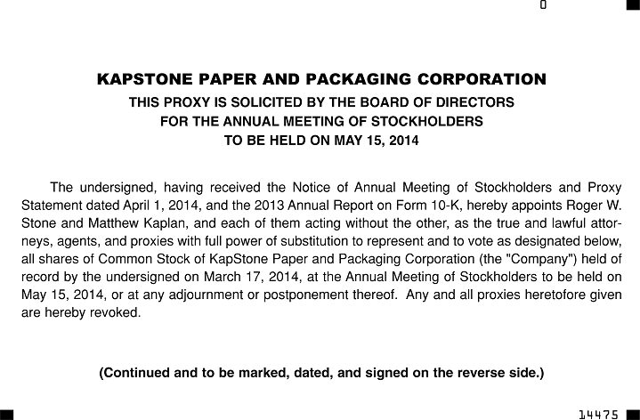 0 --------------- . . . . . . . . . . . . . . . . . . . . . . . . . . . . . . . . . . . . . . . . . . . . . . . . . . . . . . ---------------- 14475 KAPSTONE PAPER AND PACKAGING CORPORATION THIS PROXY IS SOLICITED BY THE BOARD OF DIRECTORS FOR THE ANNUAL MEETING OF STOCKHOLDERS TO BE HELD ON MAY 15, 2014 The undersigned, having received the Notice of Annual Meeting of Stockholders and Proxy Statement dated April 1, 2014, and the 2013 Annual Report on Form 10-K, hereby appoints Roger W. Stone and Matthew Kaplan, and each of them acting without the other, as the true and lawful attorneys, agents, and proxies with full power of substitution to represent and to vote as designated below, all shares of Common Stock of KapStone Paper and Packaging Corporation (the "Company") held of record by the undersigned on March 17, 2014, at the Annual Meeting of Stockholders to be held on May 15, 2014, or at any adjournment or postponement thereof. Any and all proxies heretofore given are hereby revoked. (Continued and to be marked, dated, and signed on the reverse side.) |