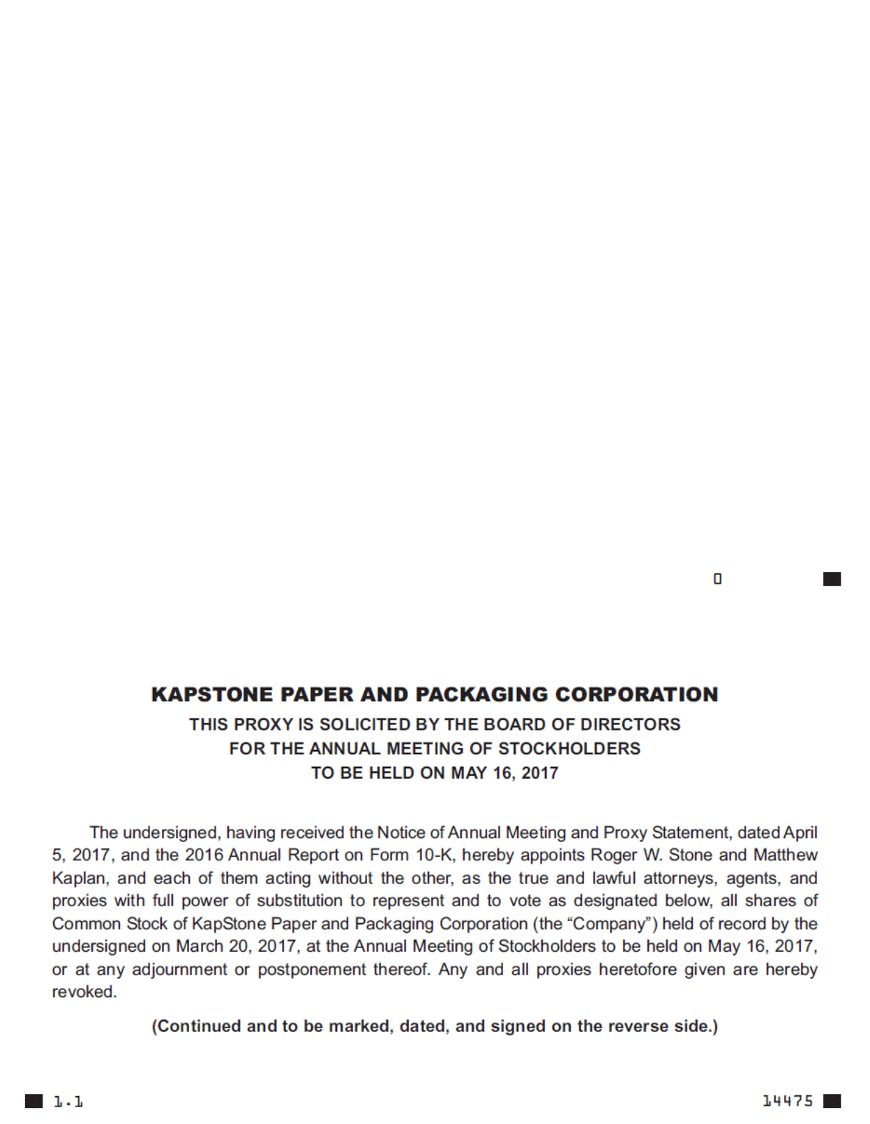 - 0 KAPSTONE PAPER AND PACKAGING CORPORATION THIS PROXY IS SOLICITED BY THE BOARD OF DIRECTORS FOR THE ANNUAL MEETING OF STOCKHOLDERS TO BE HELD ON MAY 16, 2017 The undersigned, having received the Notice of Annual Meeting and Proxy Statement, dated April 5, 2017, and the 2016 Annual Report on Form 10-K, hereby appoints Roger W. Stone and Matthew Kaplan, and each of them acting without the other, as the true and lawful attorneys, agents, and proxies with full power of substitution to represent and to vote as designated below, all shares of Common Stock of KapStone Paper and Packaging Corporation (the “Company”) held of record by the undersigned on March 20, 2017, at the Annual Meeting of Stockholders to be held on May 16, 2017, or at any adjournment or postponement thereof. Any and all proxies heretofore given are hereby revoked. (Continued and to be marked, dated, and signed on the reverse side.) 14475 1.1