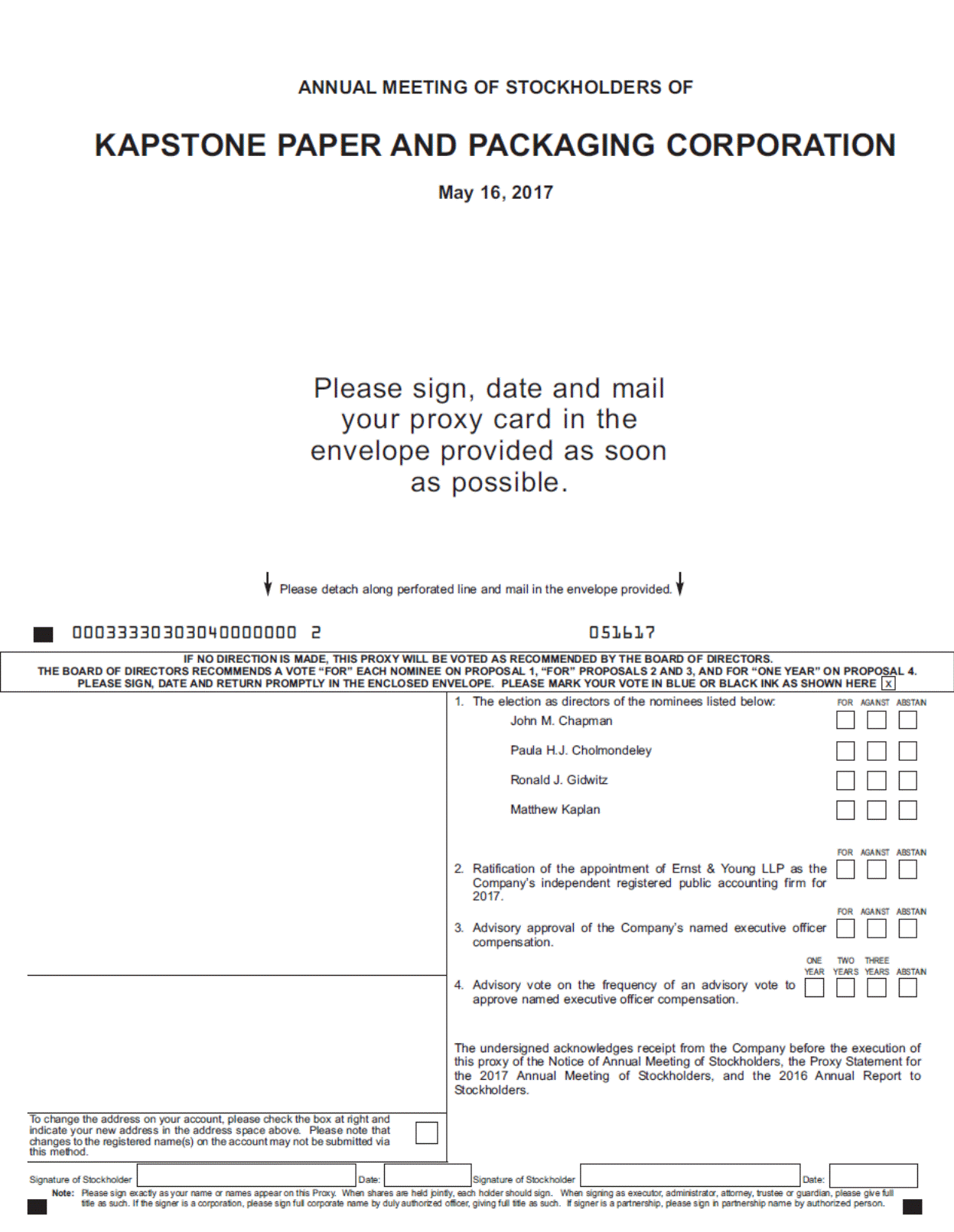 ANNUAL MEETING OF STOCKHOLDERS OF KAPSTONE PAPER AND PACKAGING CORPORATION May 16, 2017 Please sign, date and mail your proxy card in the envelope provided as soon as possible. Please detach along perforated line and mail in the envelope provided. 00033330303040000000 2 051617 changes to the registered name(s) on the account may not be submitted via Note: Please sign exactly as your name or names appear on this Proxy. When shares are held jointly, each holder should sign. When signing as executor, administrator, attorney, trustee or guardian, please give full title as such. If the signer is a corporation, please sign full corporate name by duly authorized officer, giving full title as such. If signer is a partnership, please sign in partnership name by authorized person. IF NO DIRECTION IS MADE, THIS PROXY WILL BE VOTED AS RECOMMENDED BY THE BOARD OF DIRECTORS. THE BOARD OF DIRECTORS RECOMMENDS A VOTE “FOR” EACH NOMINEE ON PROPOSAL 1, “FOR” PROPOSALS 2 AND 3, AND FOR “ONE YEAR” ON PROPOSAL 4. PLEASE SIGN, DATE AND RETURN PROMPTLY IN THE ENCLOSED ENVELOPE. PLEASE MARK YOUR VOTE IN BLUE OR BLACK INK AS SHOWN HERE x 1. The election as directors of the nominees listed below:FOR AGAINST ABSTAIN John M. Chapman Paula H.J. Cholmondeley Ronald J. Gidwitz Matthew Kaplan FOR AGAINST ABSTAIN 2. Ratification of the appointment of Ernst & Young LLP as the Company’s independent registered public accounting firm for 2017. FOR AGAINST ABSTAIN 3. Advisory approval of the Company’s named executive officer compensation. ONETWO THREE YEAR YEARS YEARS ABSTAIN 4. Advisory vote on the frequency of an advisory vote to approve named executive officer compensation. The undersigned acknowledges receipt from the Company before the execution of this proxy of the Notice of Annual Meeting of Stockholders, the Proxy Statement for the 2017 Annual Meeting of Stockholders, and the 2016 Annual Report to Stockholders. To change the address on your account, please check the box at right and indicate your new address in the address space above. Please note that this method. Signature of Stockholder Date: Signature of StockholderDate: