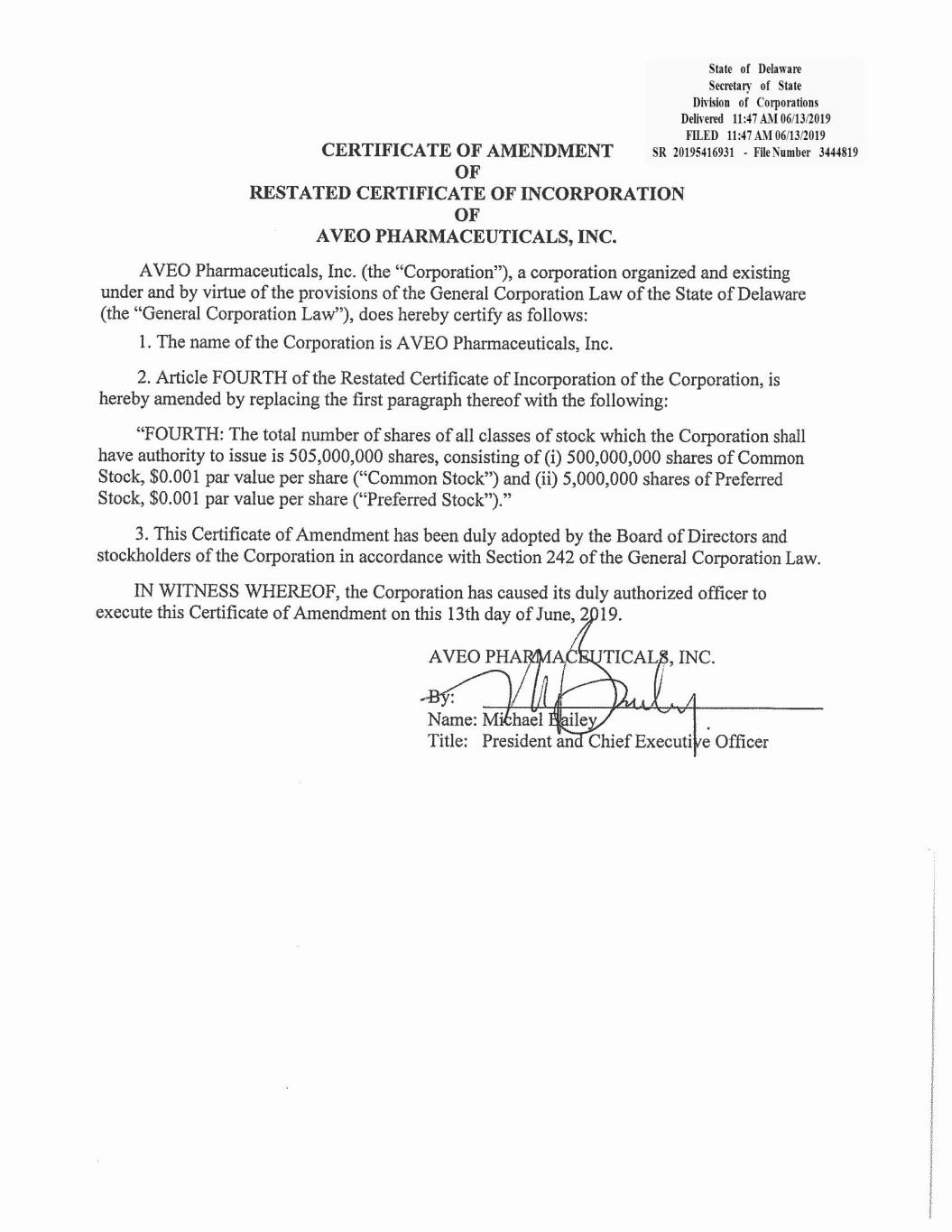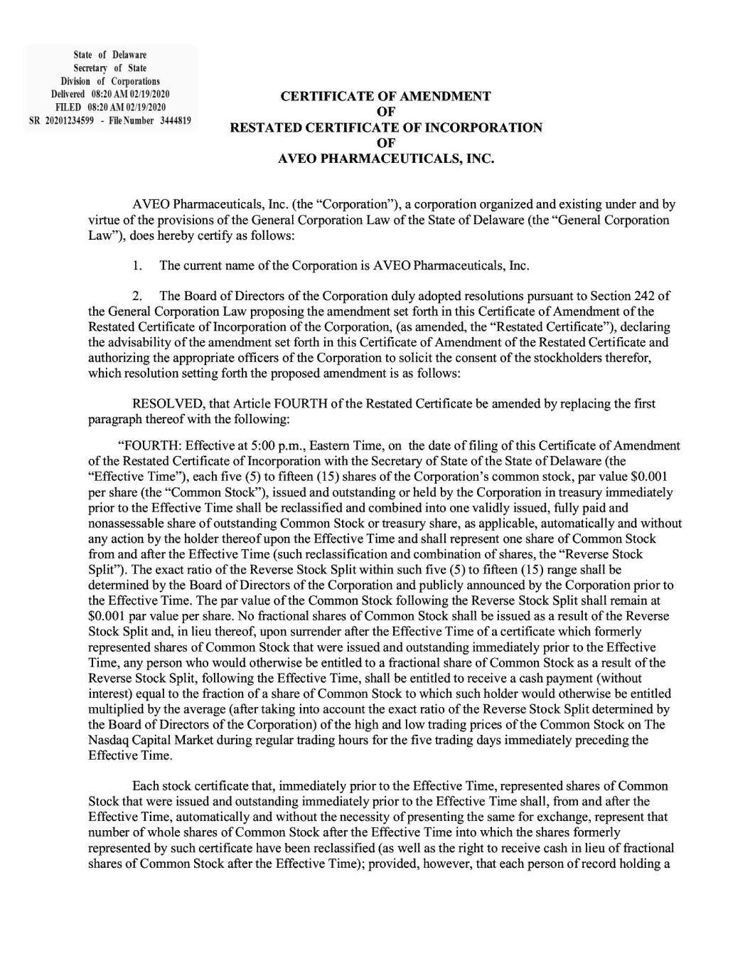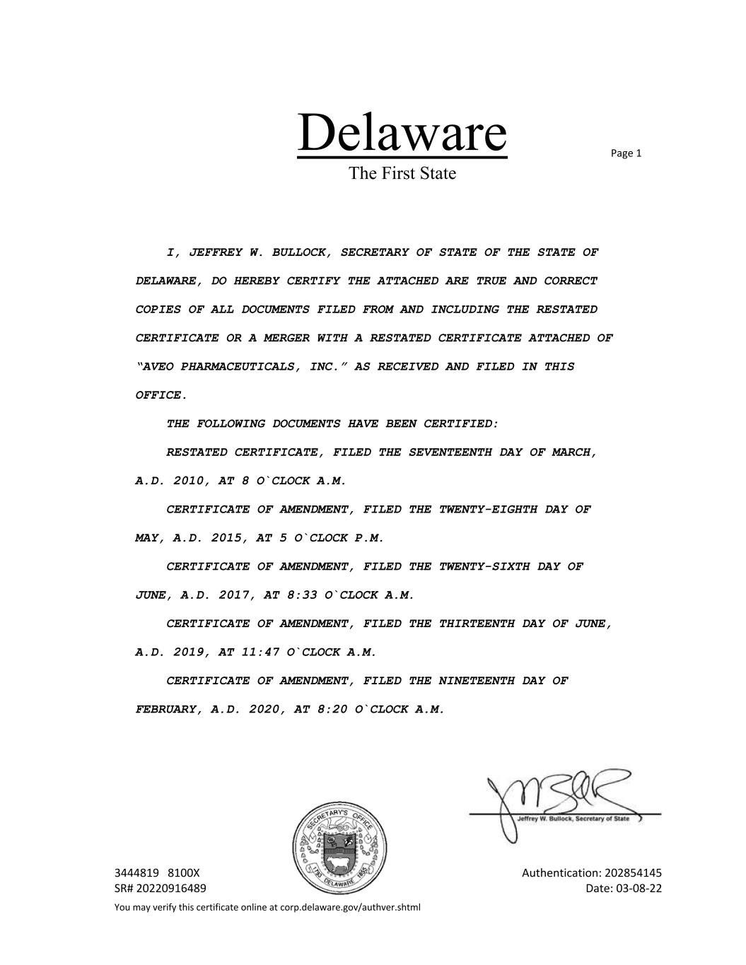 Delaware The First State Page 1 3444819 8100X Authentication: 202854145 SR# 20220916489 Date: 03-08-22 You may verify this certificate online at corp.delaware.gov/authver.shtml I, JEFFREY W. BULLOCK, SECRETARY OF STATE OF THE STATE OF DELAWARE, DO HEREBY CERTIFY THE ATTACHED ARE TRUE AND CORRECT COPIES OF ALL DOCUMENTS FILED FROM AND INCLUDING THE RESTATED CERTIFICATE OR A MERGER WITH A RESTATED CERTIFICATE ATTACHED OF “AVEO PHARMACEUTICALS, INC.” AS RECEIVED AND FILED IN THIS OFFICE. THE FOLLOWING DOCUMENTS HAVE BEEN CERTIFIED: RESTATED CERTIFICATE, FILED THE SEVENTEENTH DAY OF MARCH, A.D. 2010, AT 8 O`CLOCK A.M. CERTIFICATE OF AMENDMENT, FILED THE TWENTY-EIGHTH DAY OF MAY, A.D. 2015, AT 5 O`CLOCK P.M. CERTIFICATE OF AMENDMENT, FILED THE TWENTY-SIXTH DAY OF JUNE, A.D. 2017, AT 8:33 O`CLOCK A.M. CERTIFICATE OF AMENDMENT, FILED THE THIRTEENTH DAY OF JUNE, A.D. 2019, AT 11:47 O`CLOCK A.M. CERTIFICATE OF AMENDMENT, FILED THE NINETEENTH DAY OF FEBRUARY, A.D. 2020, AT 8:20 O`CLOCK A.M.