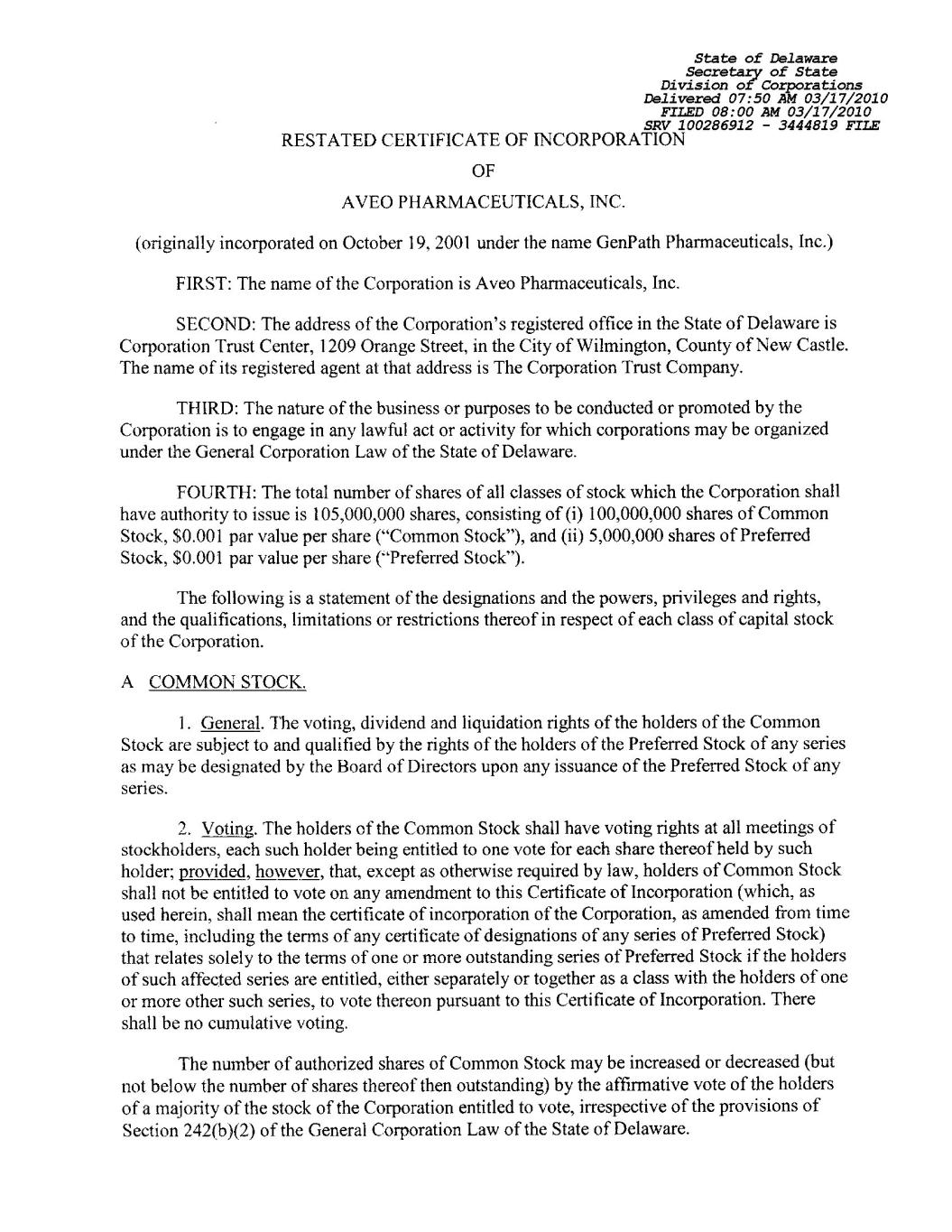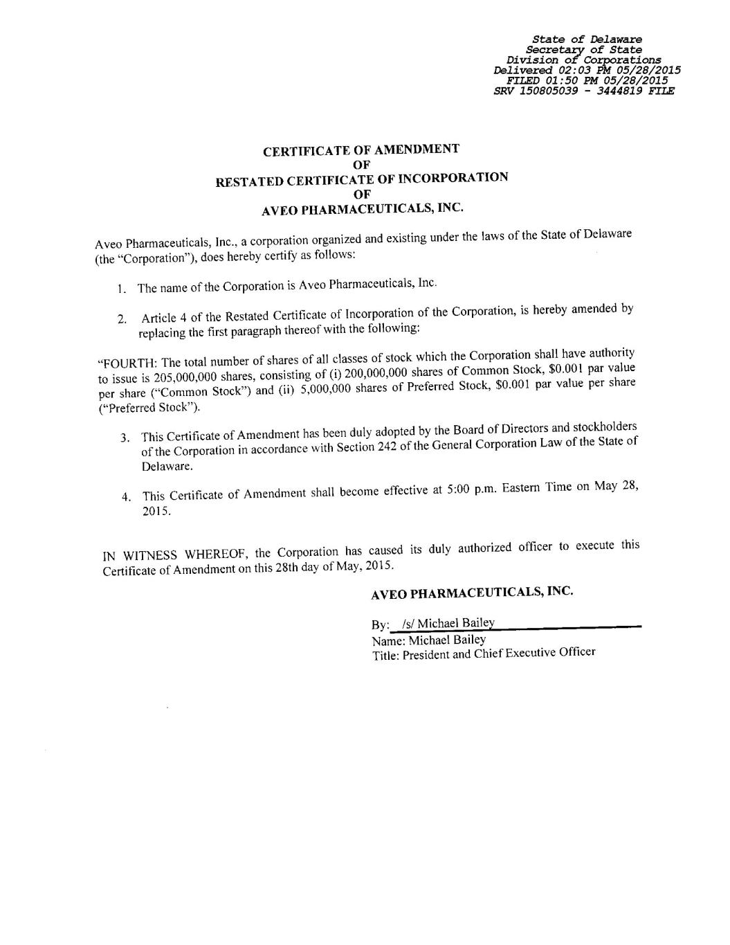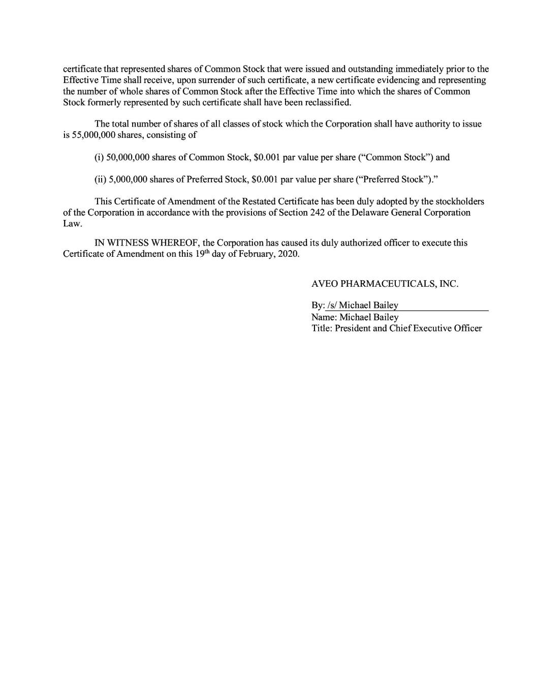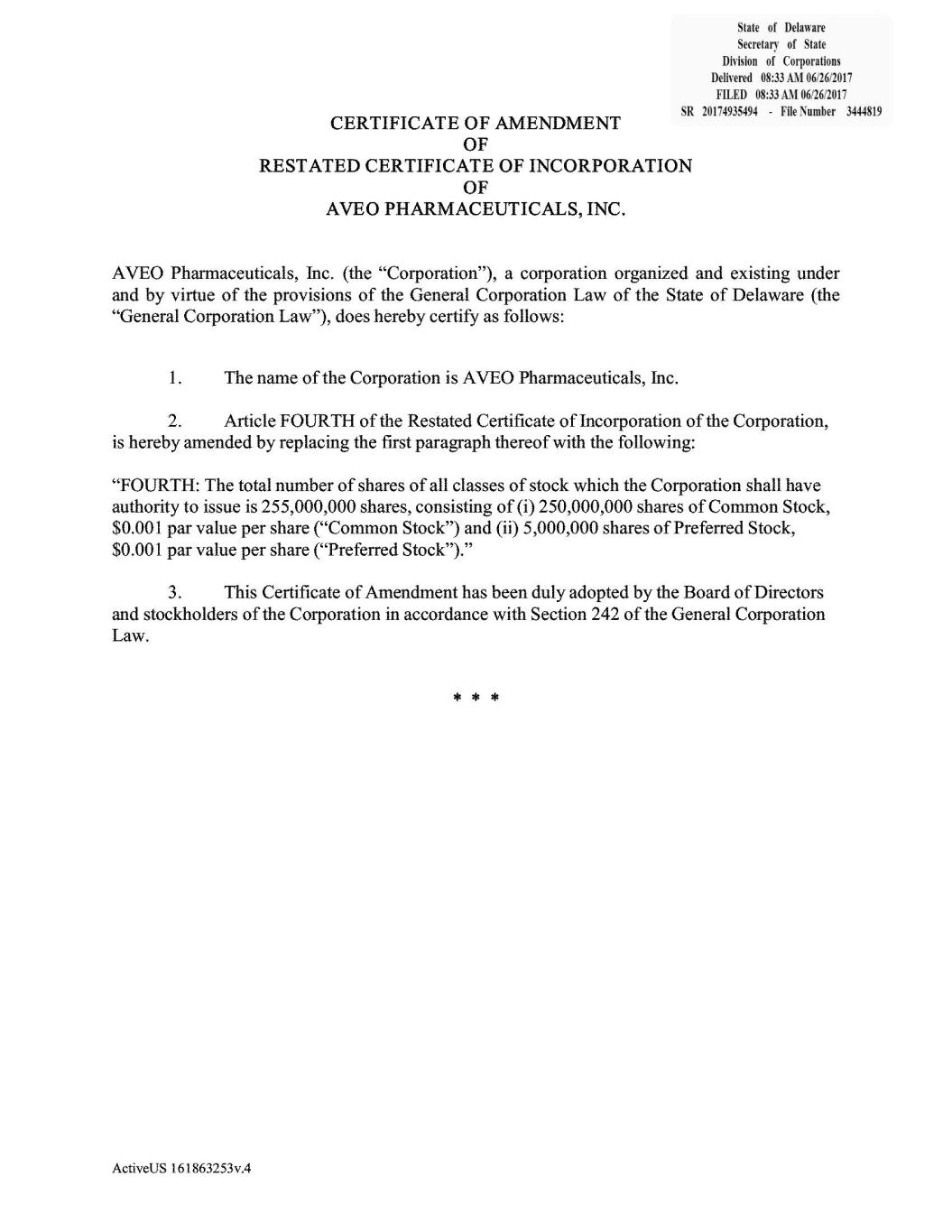 Delaware The First State Page 1 3444819 8100X Authentication: 202854145 SR# 20220916489 Date: 03-08-22 You may verify this certificate online at corp.delaware.gov/authver.shtml I, JEFFREY W. BULLOCK, SECRETARY OF STATE OF THE STATE OF DELAWARE, DO HEREBY CERTIFY THE ATTACHED ARE TRUE AND CORRECT COPIES OF ALL DOCUMENTS FILED FROM AND INCLUDING THE RESTATED CERTIFICATE OR A MERGER WITH A RESTATED CERTIFICATE ATTACHED OF “AVEO PHARMACEUTICALS, INC.” AS RECEIVED AND FILED IN THIS OFFICE. THE FOLLOWING DOCUMENTS HAVE BEEN CERTIFIED: RESTATED CERTIFICATE, FILED THE SEVENTEENTH DAY OF MARCH, A.D. 2010, AT 8 O`CLOCK A.M. CERTIFICATE OF AMENDMENT, FILED THE TWENTY-EIGHTH DAY OF MAY, A.D. 2015, AT 5 O`CLOCK P.M. CERTIFICATE OF AMENDMENT, FILED THE TWENTY-SIXTH DAY OF JUNE, A.D. 2017, AT 8:33 O`CLOCK A.M. CERTIFICATE OF AMENDMENT, FILED THE THIRTEENTH DAY OF JUNE, A.D. 2019, AT 11:47 O`CLOCK A.M. CERTIFICATE OF AMENDMENT, FILED THE NINETEENTH DAY OF FEBRUARY, A.D. 2020, AT 8:20 O`CLOCK A.M.