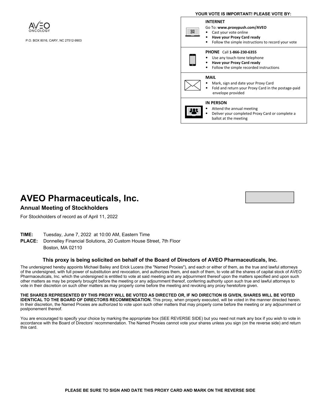 YOUR VOTE IS IMPORTANT! PLEASE VOTE BY: AVEO Pharmaceuticals, Inc. Annual Meeting of Stockholders For Stockholders of record as of April 11, 2022 TIME: Tuesday, June 7, 2022 at 10:00 AM, Eastern Time PLACE: Donnelley Financial Solutions, 20 Custom House Street, 7th Floor Boston, MA 02110 This proxy is being solicited on behalf of the Board of Directors of AVEO Pharmaceuticals, Inc. The undersigned hereby appoints Michael Bailey and Erick Lucera (the "Named Proxies"), and each or either of them, as the true and lawful attorneys of the undersigned, with full power of substitution and revocation, and authorizes them, and each of them, to vote all the shares of capital stock of AVEO Pharmaceuticals, Inc. which the undersigned is entitled to vote at said meeting and any adjournment thereof upon the matters specified and upon such other matters as may be properly brought before the meeting or any adjournment thereof, conferring authority upon such true and lawful attorneys to vote in their discretion on such other matters as may properly come before the meeting and revoking any proxy heretofore given. THE SHARES REPRESENTED BY THIS PROXY WILL BE VOTED AS DIRECTED OR, IF NO DIRECTION IS GIVEN, SHARES WILL BE VOTED IDENTICAL TO THE BOARD OF DIRECTORS RECOMMENDATION. This proxy, when properly executed, will be voted in the manner directed herein. In their discretion, the Named Proxies are authorized to vote upon such other matters that may properly come before the meeting or any adjournment or postponement thereof. You are encouraged to specify your choice by marking the appropriate box (SEE REVERSE SIDE) but you need not mark any box if you wish to vote in accordance with the Board of Directors’ recommendation. The Named Proxies cannot vote your shares unless you sign (on the reverse side) and return this card. PLEASE BE SURE TO SIGN AND DATE THIS PROXY CARD AND MARK ON THE REVERSE SIDE P.O. BOX 8016, CARY, NC 27512-9903 INTERNET Go To: www.proxypush.com/AVEO • Cast your vote online • Have your Proxy Card ready • Follow the simple instructions to record your vote PHONE Call 1-866-230-6355 • Use any touch-tone telephone • Have your Proxy Card ready • Follow the simple recorded instructions MAIL • Mark, sign and date your Proxy Card • Fold and return your Proxy Card in the postage-paid envelope provided IN PERSON • Attend the annual meeting • Deliver your completed Proxy Card or complete a ballot at the meeting