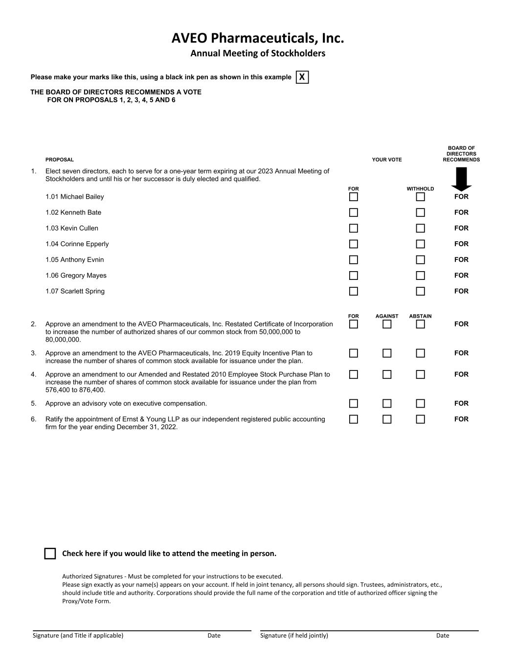 AVEO Pharmaceuticals, Inc. Annual Meeting of Stockholders THE BOARD OF DIRECTORS RECOMMENDS A VOTE FOR ON PROPOSALS 1, 2, 3, 4, 5 AND 6 PROPOSAL YOUR VOTE BOARD OF DIRECTORS RECOMMENDS 1. Elect seven directors, each to serve for a one-year term expiring at our 2023 Annual Meeting of Stockholders and until his or her successor is duly elected and qualified. FOR WITHHOLD 1.01 Michael Bailey #P2# #P2# FOR 1.02 Kenneth Bate #P3# #P3# FOR 1.03 Kevin Cullen #P4# #P4# FOR 1.04 Corinne Epperly #P5# #P5# FOR 1.05 Anthony Evnin #P6# #P6# FOR 1.06 Gregory Mayes #P7# #P7# FOR 1.07 Scarlett Spring #P8# #P8# FOR FOR AGAINST ABSTAIN 2. Approve an amendment to the AVEO Pharmaceuticals, Inc. Restated Certificate of Incorporation to increase the number of authorized shares of our common stock from 50,000,000 to 80,000,000. #P9# #P9# #P9# FOR 3. Approve an amendment to the AVEO Pharmaceuticals, Inc. 2019 Equity Incentive Plan to increase the number of shares of common stock available for issuance under the plan. #P10# #P10# #P10# FOR 4. Approve an amendment to our Amended and Restated 2010 Employee Stock Purchase Plan to increase the number of shares of common stock available for issuance under the plan from 576,400 to 876,400. #P11# #P11# #P11# FOR 5. Approve an advisory vote on executive compensation. #P12# #P12# #P12# FOR 6. Ratify the appointment of Ernst & Young LLP as our independent registered public accounting firm for the year ending December 31, 2022. #P13# #P13# #P13# FOR Check here if you would like to attend the meeting in person. Authorized Signatures - Must be completed for your instructions to be executed. Please sign exactly as your name(s) appears on your account. If held in joint tenancy, all persons should sign. Trustees, administrators, etc., should include title and authority. Corporations should provide the full name of the corporation and title of authorized officer signing the Proxy/Vote Form. Signature (and Title if applicable) Proposal_Page - VIFL Date DateSignature (if held jointly) XPlease make your marks like this, using a black ink pen as shown in this example